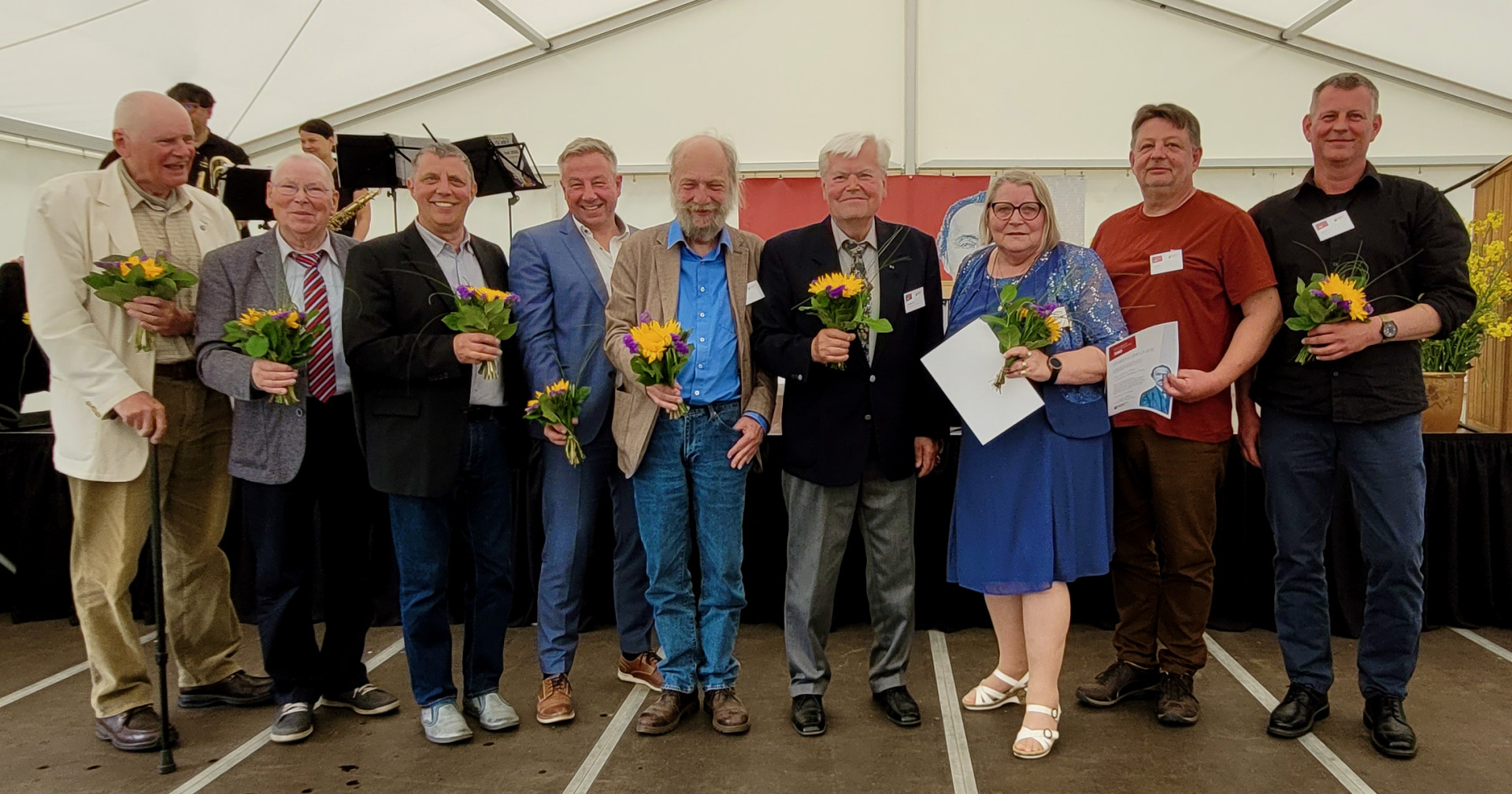 Foto unten: Die Ehrengäste des Festaktes: Peter Voppmann, Albert Kruse, Rainer Hilse, Prof. Dr. Matthias Wemhoff, Wout Arentzen, Dr. Wilfried Bölke, Sybille Galka, Ole Preik, Jan Preik
