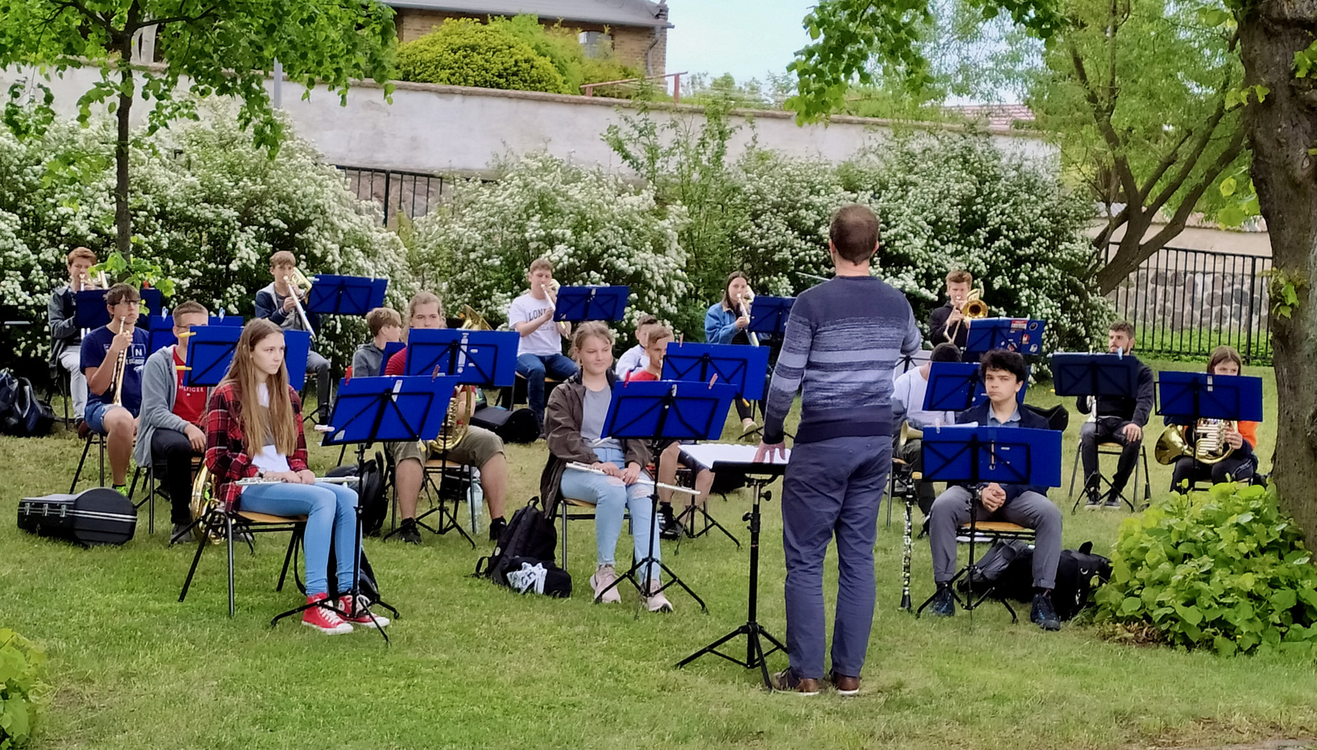Am 1. Juni, dem Internationalen Kindertag, war es soweit: In der Kreismusikschule Müritz und ihren Außenstellen in Malchow und Röbel wurde es lebendig. Endlich singt und klingt es wieder aus allen Räumen. Matthias Prager, Leiter des Jugendblasorchesters, nutzte die Chance und lud bereits am 1. Tag der Öffnung alle seine Ensemblespieler zu einer Probe auf den großen Schulhof ein.