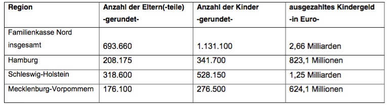 Die Familienkasse Nord mit Sitz in Hamburg ist für die drei norddeutschen Bundesländer Schleswig-Holstein, Mecklenburg-Vorpommern und Hamburg zuständig. Sie leistete im vergangenen Jahr 2018 folgende Zahlungen: