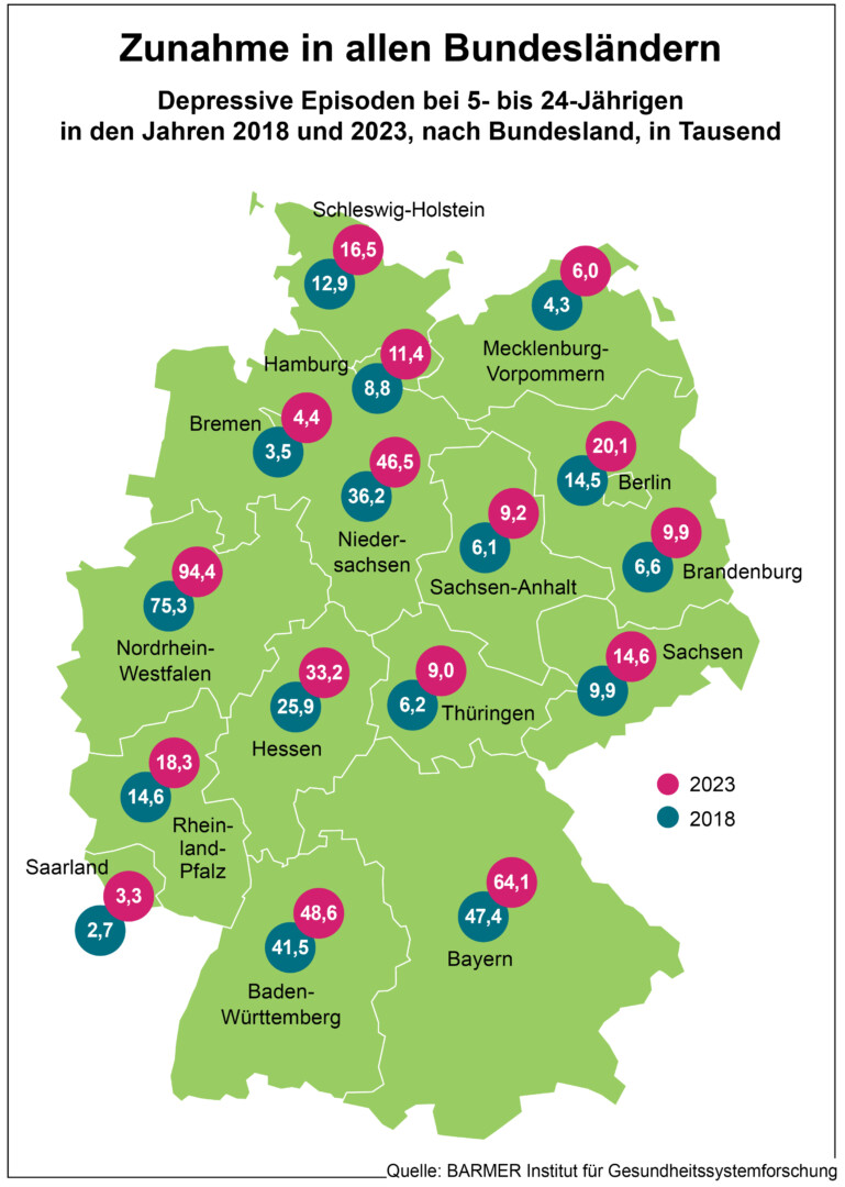Laut der Auswertung ist die Zahl der jungen Menschen mit Depressionen in allen Bundesländern zwischen den Jahren 2018 und 2023 gestiegen. Die größte Steigerung gab es mit rund 51 Prozent in Sachsen-Anhalt von circa 6.100 auf 9.200 Betroffene und die geringste mit einem Zuwachs von 17 Prozent in Baden-Württemberg von 41.500 auf 48.600 Betroffene. Die meisten Fallzahlen gab es in Nordrhein-Westfalen, die von 75.300 auf 94.400 anstiegen. Die wenigsten Diagnosen erfolgten im Saarland, deren Zahl von 2.700 auf 3.300 zunahm.