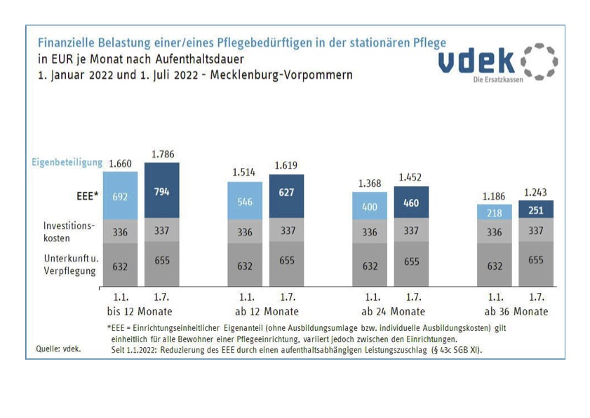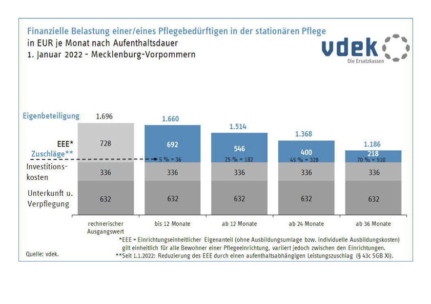 In den vergangenen Jahren sind die zu zahlenden Eigenanteile der in Mecklenburg-Vorpommern in Pflegeheimen lebenden Menschen stetig gestiegen. Eine Dynamik, die sich im ersten Halbjahr 2022 fortsetzte. So entwickelten sich die rechnerischen Eigenbeteiligungen ohne Leistungszuschlag in diesem Zeitraum nach Angaben des Ersatzkassenverbandes MV von 1.696 Euro auf 1.828 Euro. Ein Ende der Anstiege sei nicht absehbar. Für unterschiedlich starke Entlastung der Pflegebedürftigen sorgt allerdings der seit Jahresbeginn geltende Leistungszuschlag. Bei einer Aufenthaltsdauer im Pflegeheim von unter einem Jahr beträgt dieser 5 Prozent des Einrichtungseinheitlichen Eigenanteils (EEE). Ab dem zweiten Jahr sind es 25, ab dem dritten 45 und ab dem vierten Jahr 70 Prozent. Der EEE ist im Wesentlichen durch die Personalkosten beeinflusst und macht aktuell knapp 46 Prozent der monatlichen Belastung der Betroffenen aus.