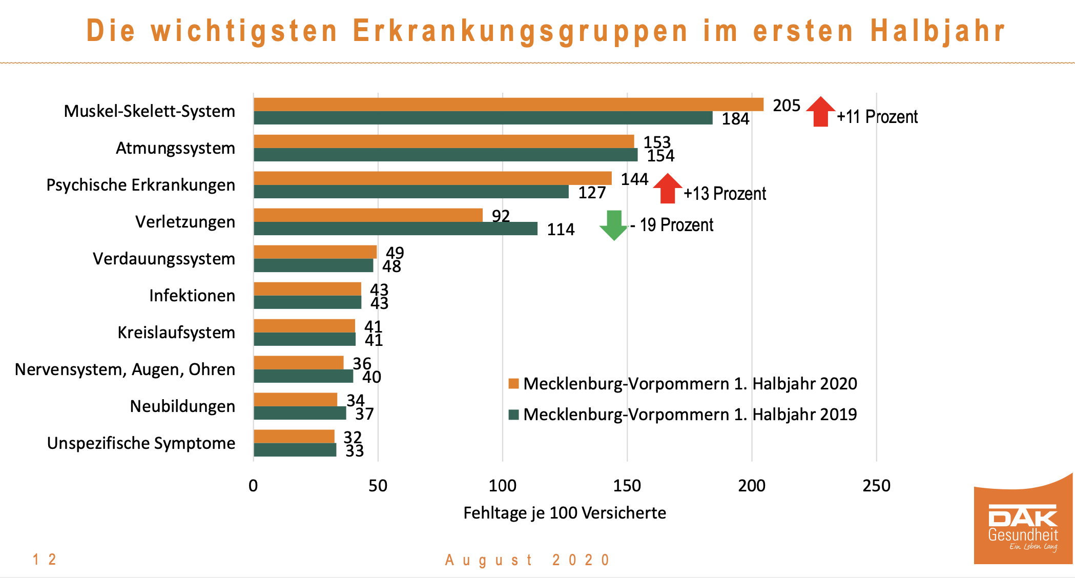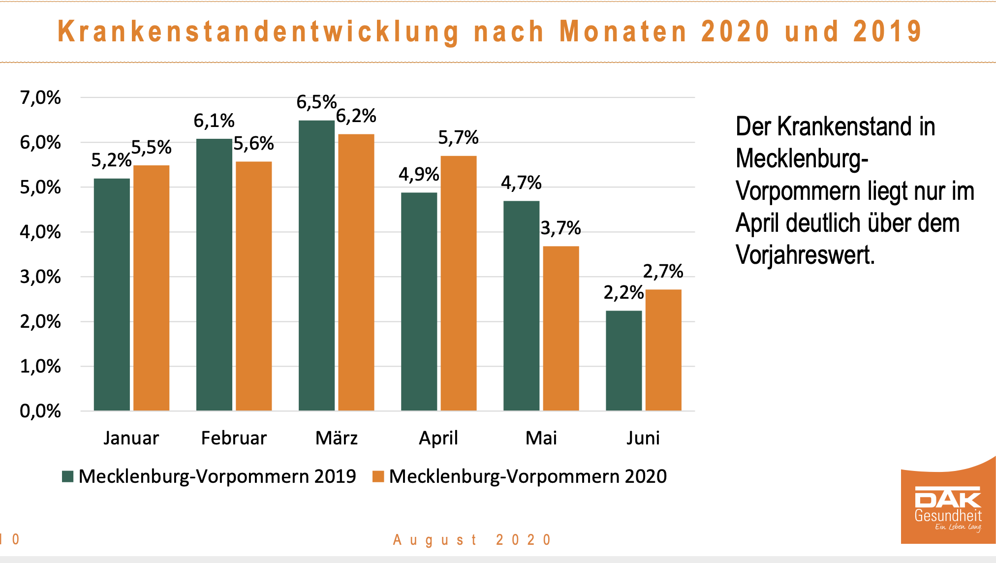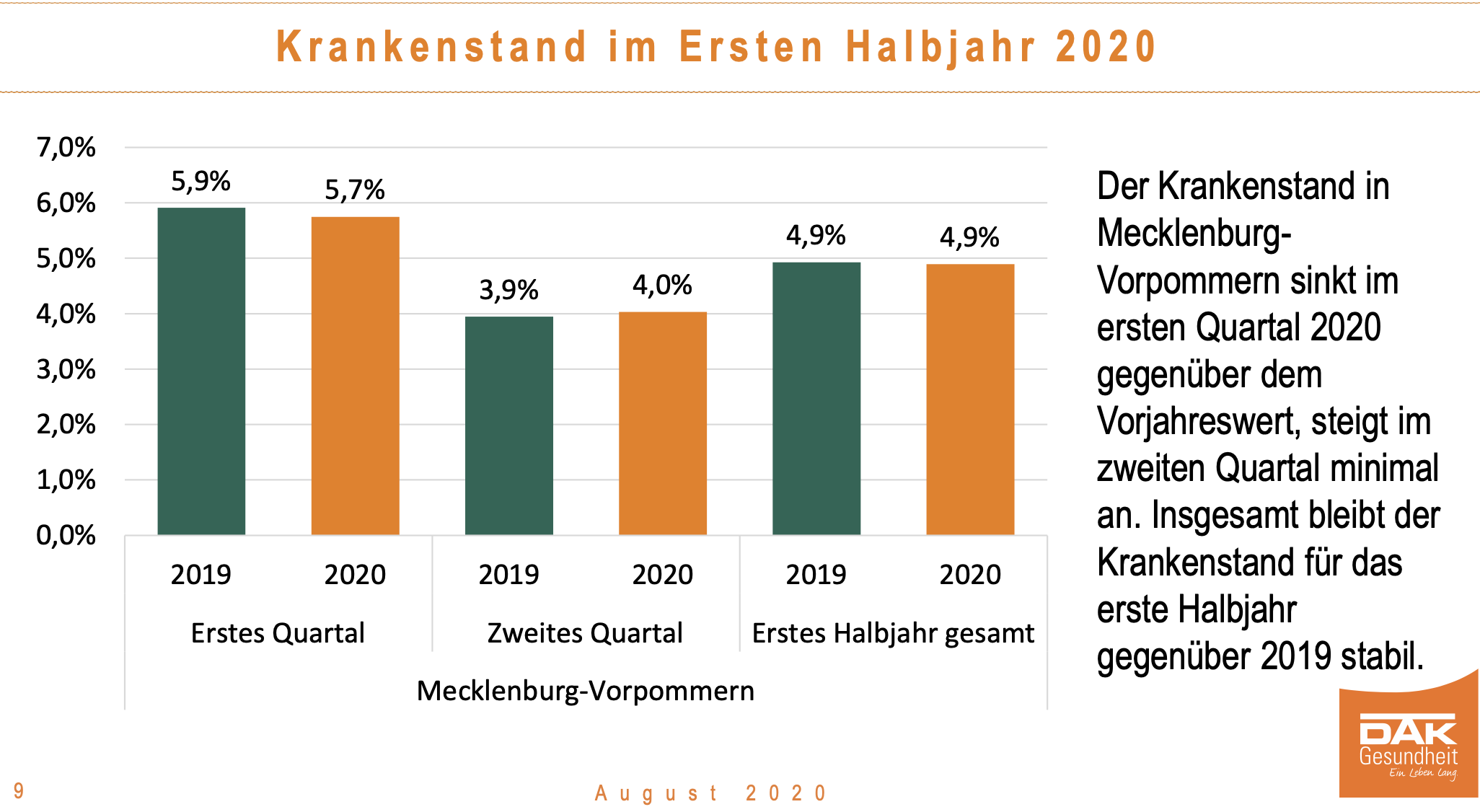 Die aktuelle Analyse der DAK-Gesundheit zeigt die Entwicklung des Krankenstandes im vergangenen Jahr und die wichtigsten Veränderungen im ersten Halbjahr 2020 auf. Demnach hatten im ersten Halbjahr 2020 DAK-versicherte Beschäftigte in Mecklenburg-Vorpommern durchschnittlich genauso viele Fehltage wie im Vorjahreshalbjahr: 8,9 Tage.