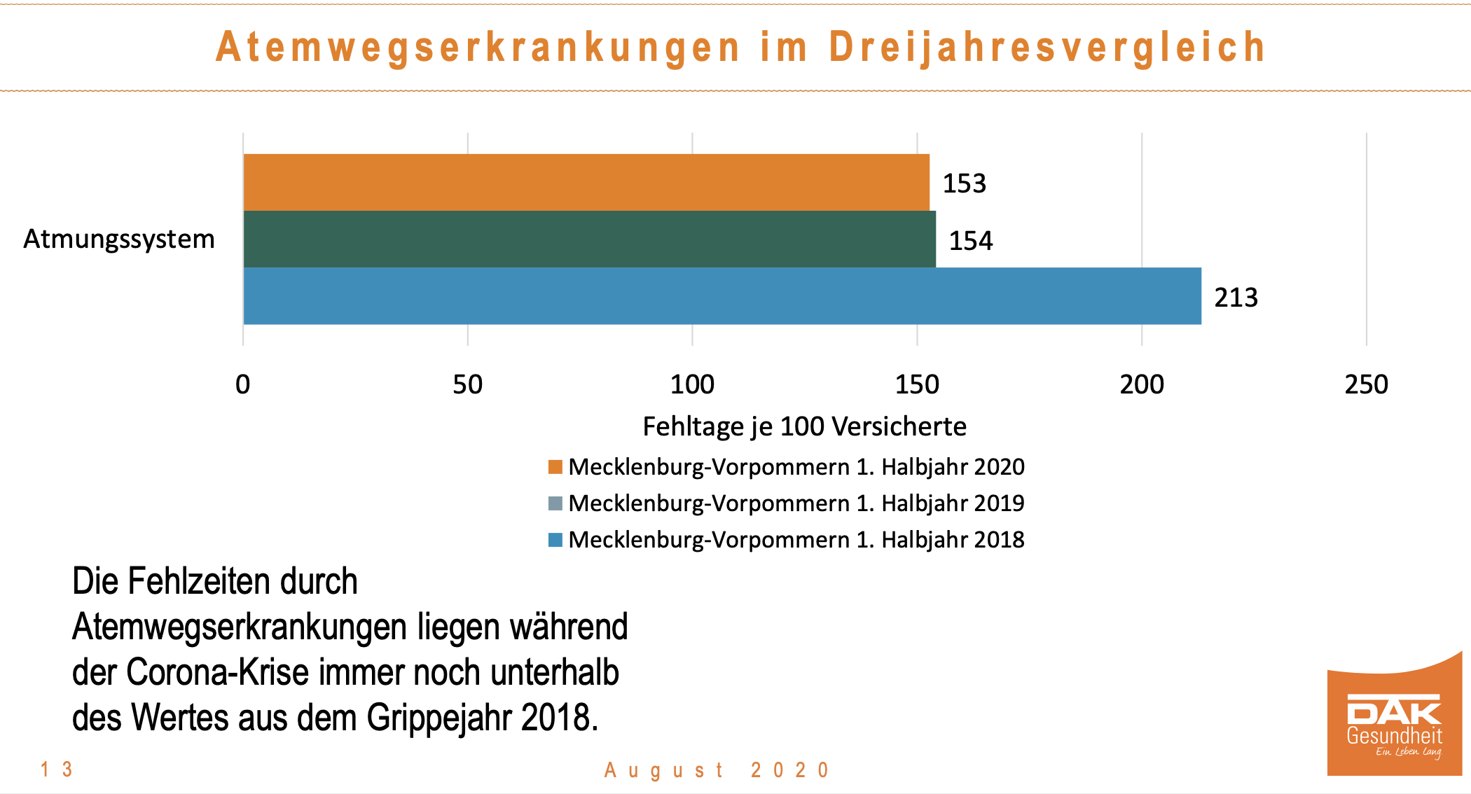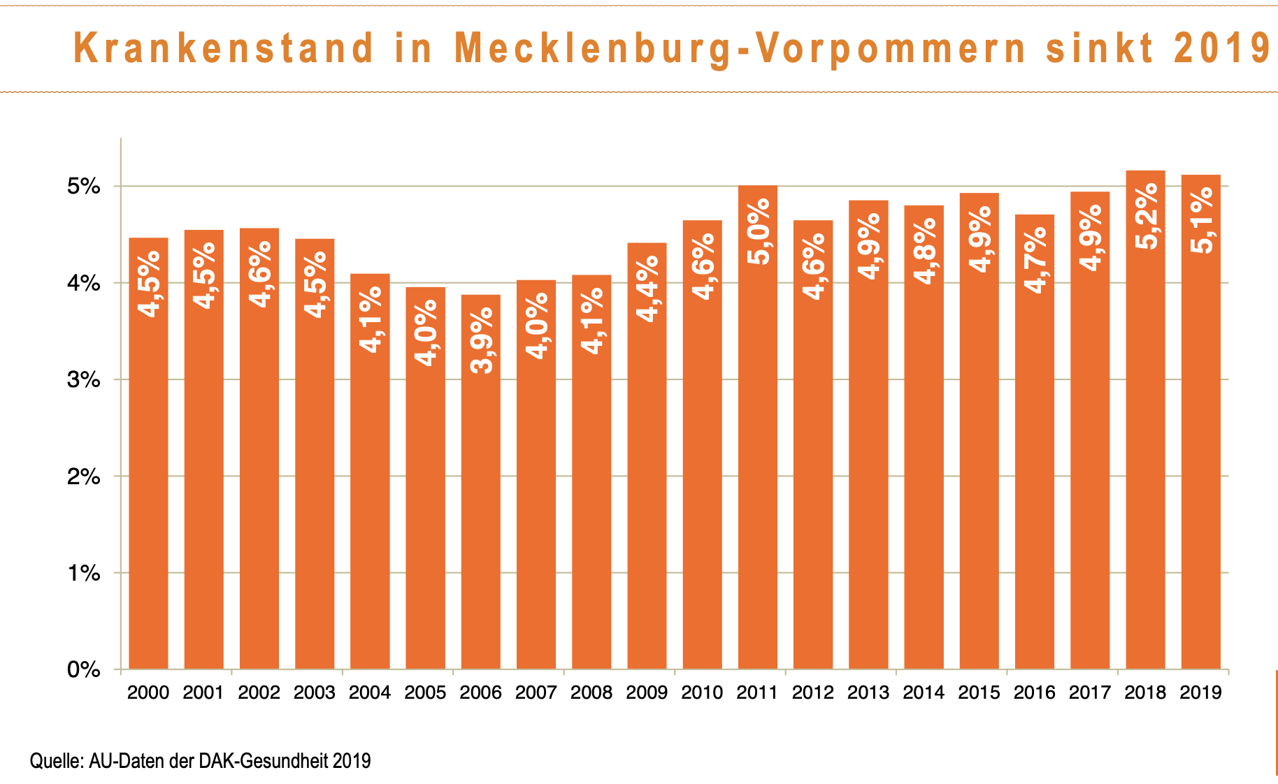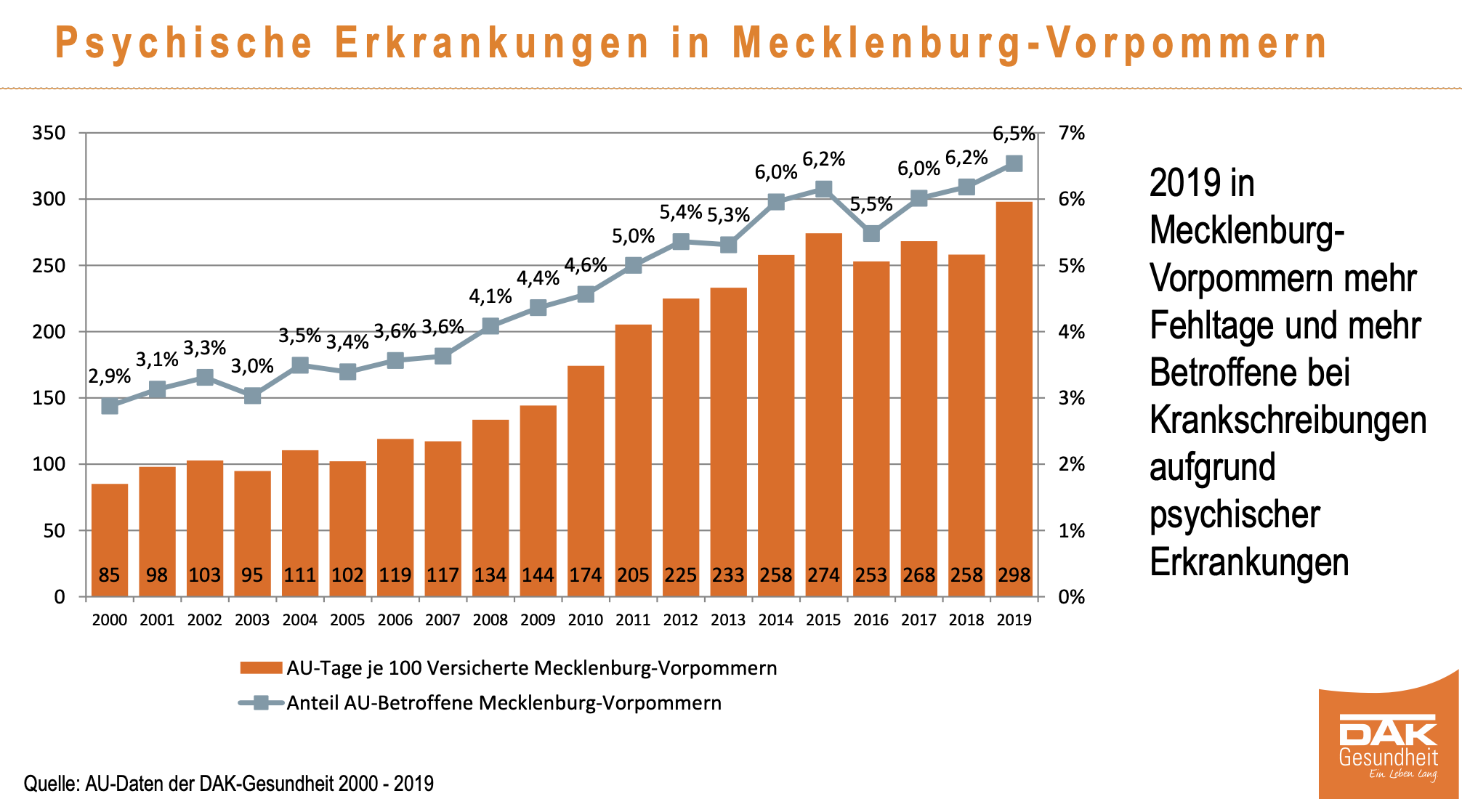 Die aktuelle Analyse der DAK-Gesundheit zeigt die Entwicklung des Krankenstandes im vergangenen Jahr und die wichtigsten Veränderungen im ersten Halbjahr 2020 auf. Demnach hatten im ersten Halbjahr 2020 DAK-versicherte Beschäftigte in Mecklenburg-Vorpommern durchschnittlich genauso viele Fehltage wie im Vorjahreshalbjahr: 8,9 Tage.