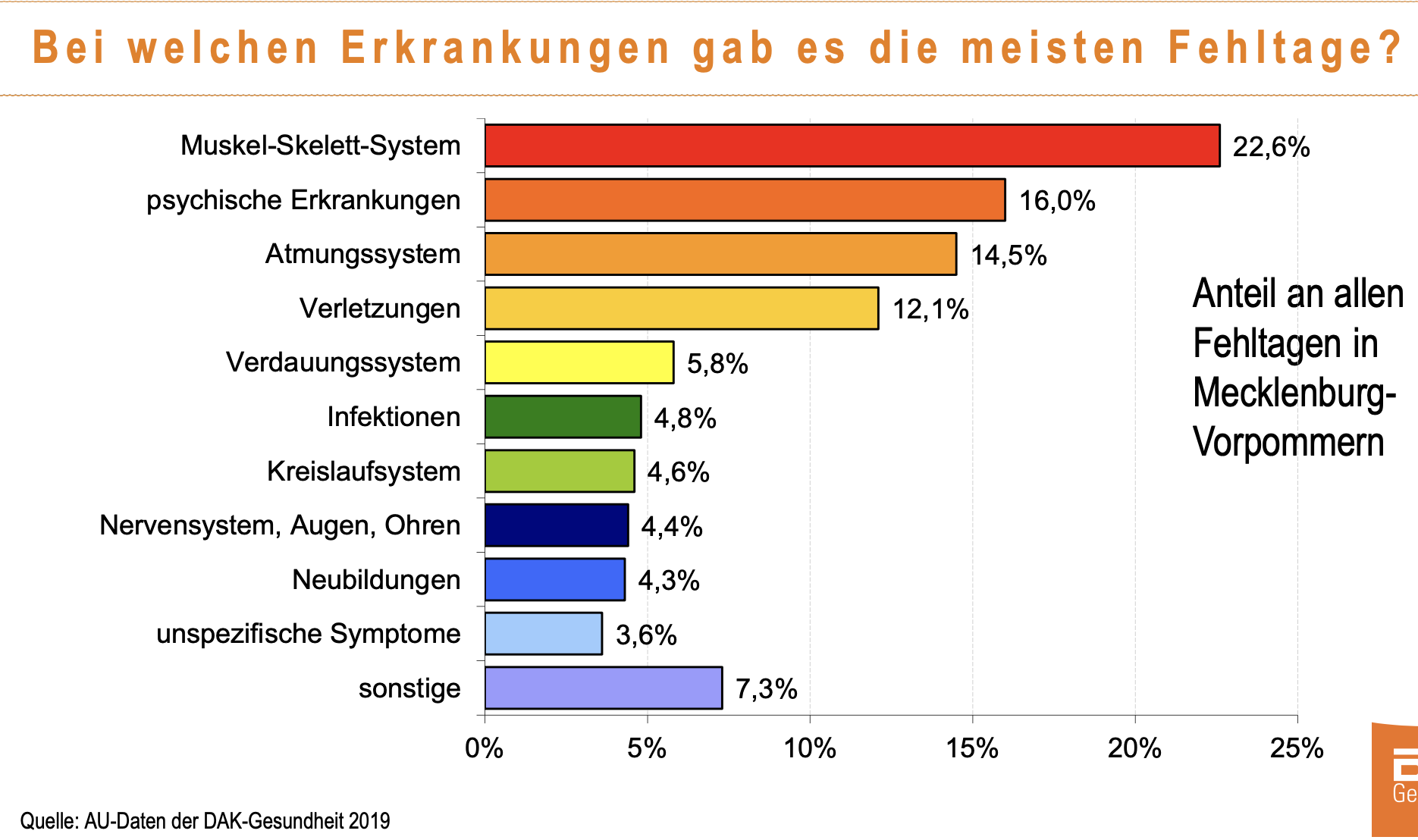 Der DAK-Gesundheitsreport für Mecklenburg-Vorpommern analysiert neben dem ersten Halbjahr 2020 auch die Fehlzeiten des vergangenen Jahres. Die Vollauswertung des gesamten Jahres 2019 zeigt: Der Krankenstand sank von 2018 auf 2019 von 5,2 Prozent auf 5,1 Prozent. An erster Stelle standen ebenfalls Krankheiten des Muskel-Skelett-Systems wie Rückenschmerzen. Sie waren für knapp jeden fünften Fehltag von Beschäftigten in Mecklenburg-Vorpommern verantwortlich (22,6 Prozent). Danach folgten psychische Erkrankungen wie beispielsweise Depressionen mit einem Anteil von 16 Prozent am Gesamtkrankenstand. An dritter Stelle standen Atemwegserkrankungen wie Grippe, Bronchitis oder Sinusitis mit 14,5 Prozent.