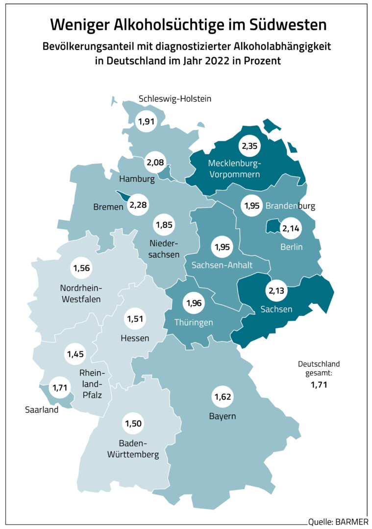 Die geringste Betroffenheit gibt es indes in Rheinland-Pfalz und Baden-Württemberg mit 1,45 beziehungsweise 1,5 Prozent. „Die massiven regionalen Unterschiede bei Alkoholabhängigkeit sind rein medizinisch nicht erklärbar. Hier dürften auch soziodemographische Faktoren eine Rolle spielen“, sagt Henning Kutzbach, Landesgeschäftsführer der Barmer in Mecklenburg-Vorpommern. Auch vorherige Analysen belegten, dass der Nordosten bei Alkoholismus trauriger Spitzenreiter sei.
