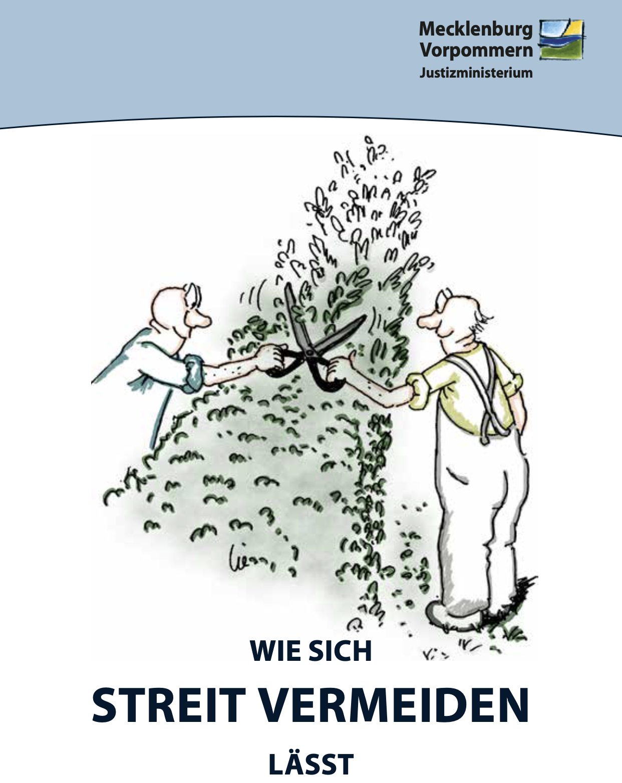 Über das Nachbarschaftsrecht in Mecklenburg-Vorpommern informiert die Broschüre „Wie sich Streit vermeiden lässt“. Sie ist kostenlos beim Justizministerium erhältlich oder online. -> Download Broschüre