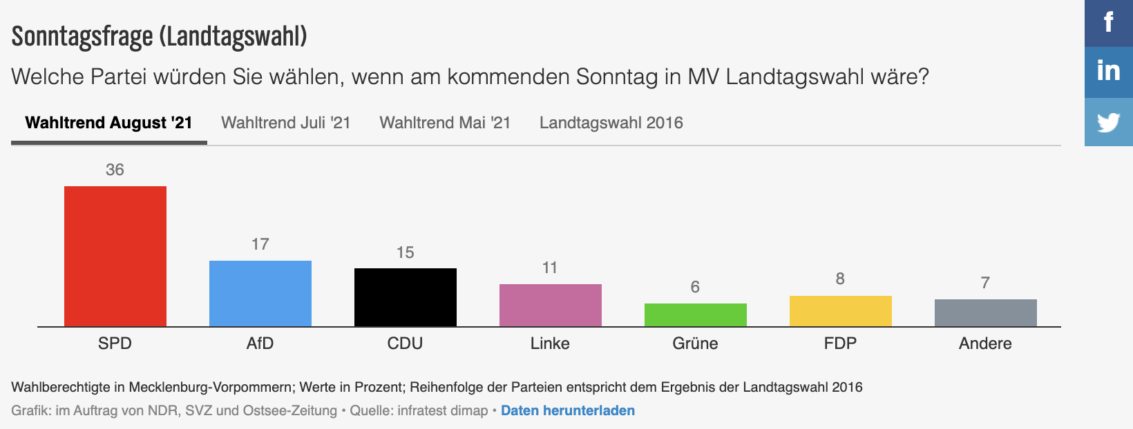 Wenn schon am nächsten Sonntag in Mecklenburg-Vorpommern gewählt würde, dann käme die SPD auf 36 Prozent. Sie erzielt damit 9 Prozentpunkte mehr als in der Umfrage von Mitte Juli. Für die Sozialdemokraten ist das der höchste Wert, den Infratest dimap in den vergangenen 20 Jahren vor einer Landtagswahl in Mecklenburg-Vorpommern gemessen hat.