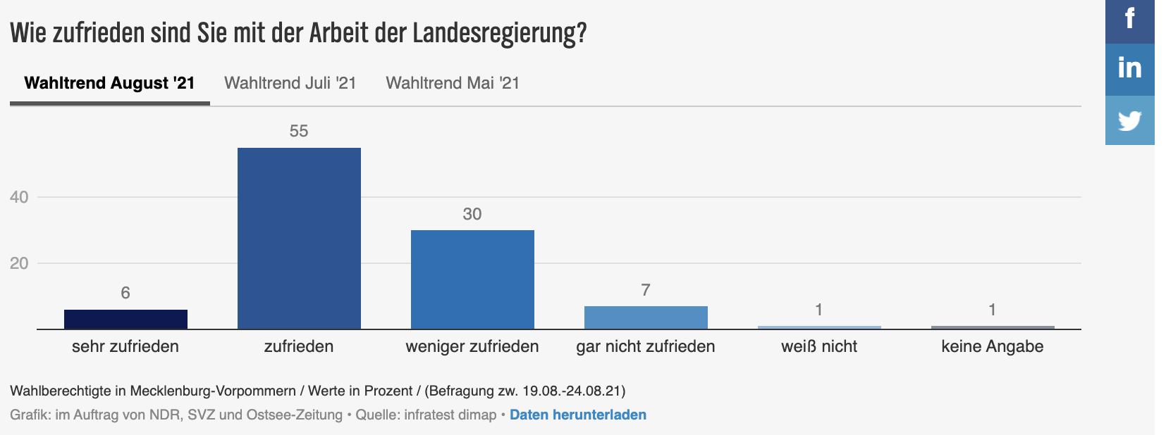 Für diese Umfrage befragte Infratest dimap im Zeitraum vom 19. bis 24. August 2021 insgesamt 1.153 wahlberechtigte Personen in Mecklenburg-Vorpommern per Telefon oder online. Die Schwankungsbreite liegt zwischen 2 Prozentpunkten (bei einem Anteilswert von 10 Prozent) und 3 Prozentpunkten (bei einem Anteilswert von 50 Prozent).