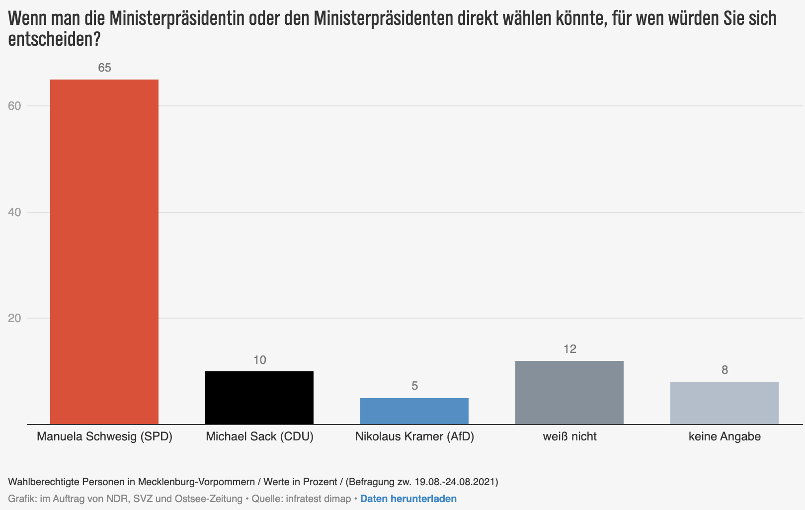 Entsprechend der überwiegend positiven Bewertung der Amtsführung der Ministerpräsidentin würden bei einer Direktwahl fast zwei Drittel für Manuela Schwesig stimmen (65 Prozent), für ihren CDU-Herausforderer Michael Sack 10 Prozent. Das positive Image der Regierungschefin kommt auch ihrer Partei zugute: Knapp die Hälfte der Wahlberechtigen finden, die SPD solle auch die nächste Landesregierung führen (49 Prozent). Die Lösung der wichtigsten Aufgaben im Land wird vorwiegend den Sozialdemokraten zugetraut (41 Prozent).