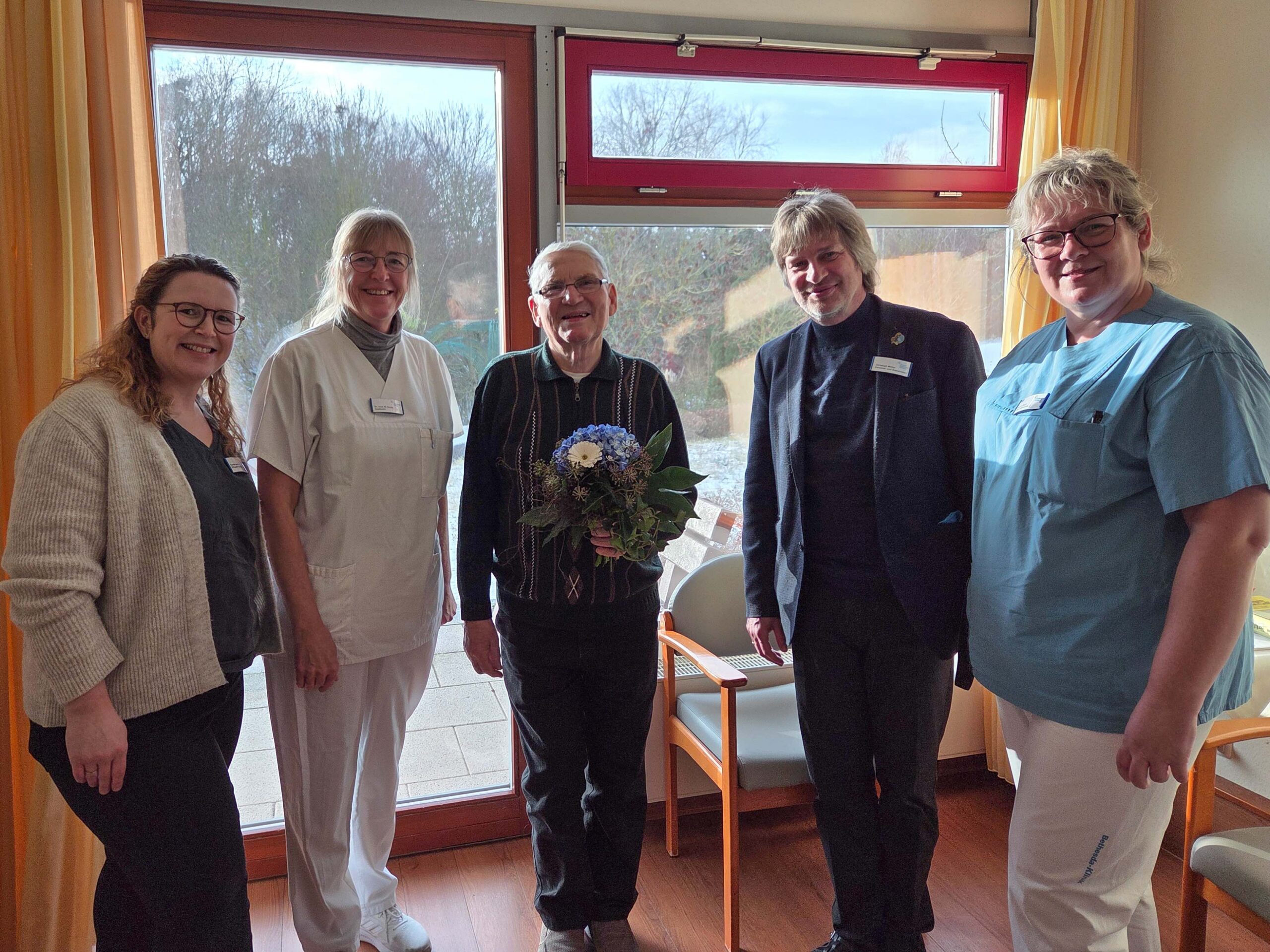 Foto unten: Horst Jüttner (Mitte) wurde als 20.000. Patient der Bethesda Klinik von Pflegedirektorin Sarah Buder (v.l.), Chefärztin Dr. med. Martina Deuter, Geschäftsführer Christoph Möller und Bereichspflegedienstleiterin Sandra Pauli begrüßt.
