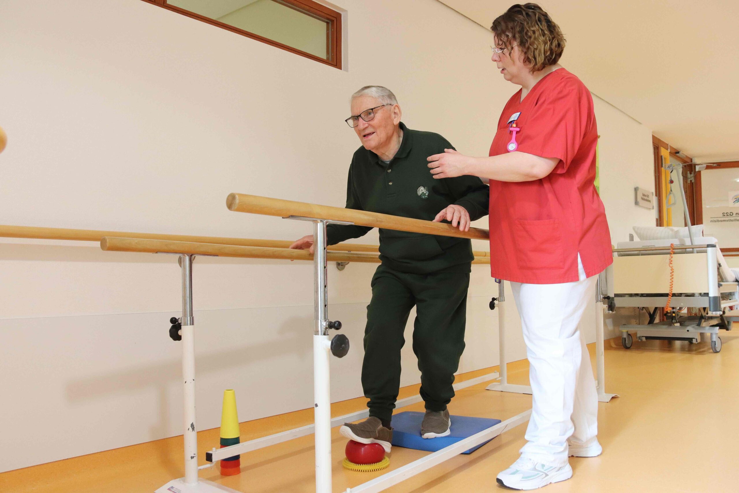 Foto oben: Horst Jüttner beim Gleichgewichtstraining am Barren mit Physiotherapeutin Steffi Gras.