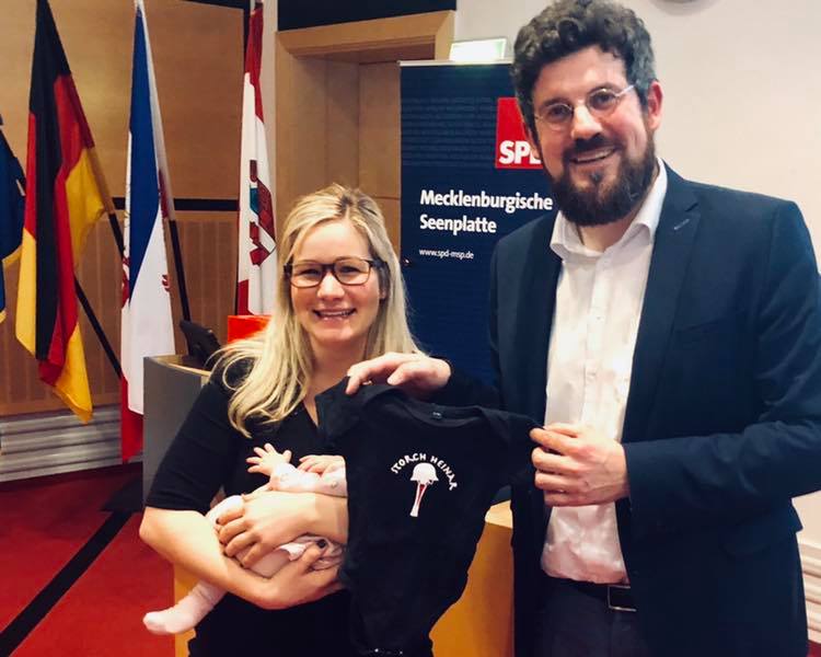 Mit dabei ihre fünf Wochen alte Tochter, die mit einem besonderen Strampler begrüßt wurde.