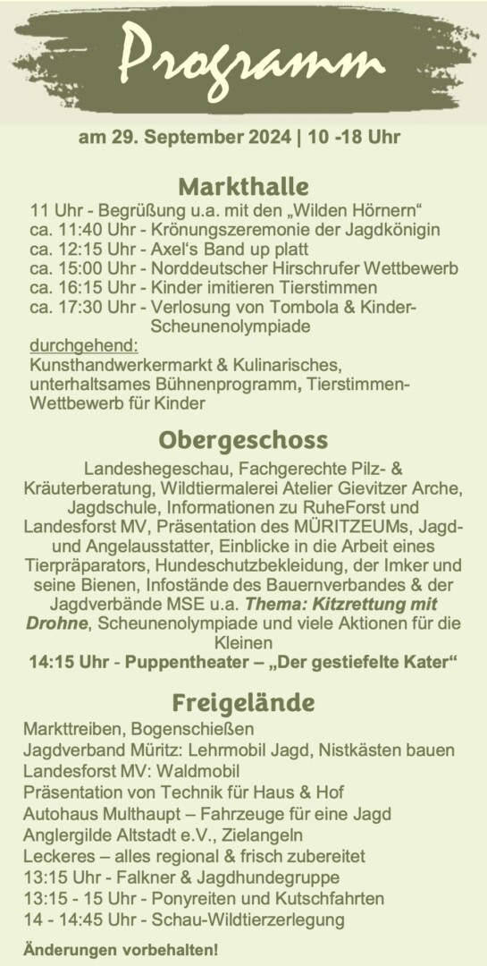 Natürlich erlebt man die Jagdhornbläser der Region, Falkner präsentieren live die Jäger der Lüfte, ausgebildeten Jagdhunde zeigen ihr Können. Das Forstamt Wredenhagen informiert u.a. über den RuheForst Müritz, Jagdzubehör wird angeboten. Dörte vom Zooladen Röbel weiß, das Angeln viel mehr als nur Fische fangen ist. Angeboten werden hochwertige handschmiedete Messer, Hundewesten und Feuertonnen. Tolle Preise hat die Jagdkönigin Patricia bei der Tombola zu vergeben.