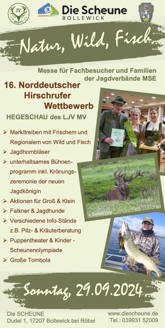 Es gibt am Wochenende wieder ungewöhnliche Geräusche in der Scheune Bollewick: Bereits zum 16. Mal wird Sonntag, 29. September der beste Hirschrufer Norddeutschlands gesucht. Dieser Wettstreit ist Höhepunkt des 18. „Jagd, Wald & Fischtages“. Mit einer naturgetreuen Wiedergabe der Brunftschreie von Hirschen beeindruckten die Teilnehmer in den letzten Jahren die Besucher. Acht Hirschrufer treffen sich zum Ruf-Duell. Dem Sieger winkt der begehrte Pokal des Kreisjagdverbandes Müritz e.V. – verbunden mit einen Preisgeld.