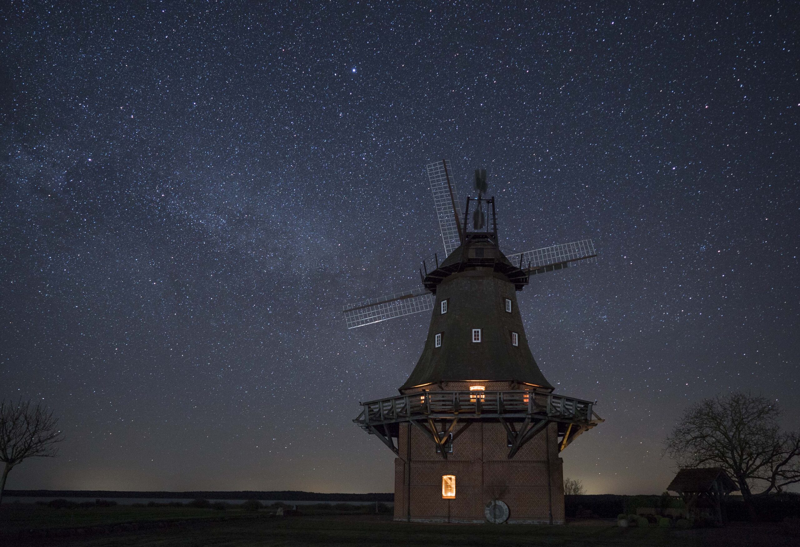 Bild: Die Mühle bei Goldberg, eines der Wahrzeichen des Naturparks Nossentiner/Schwinzer Heide, unterm Sternenhimmel.