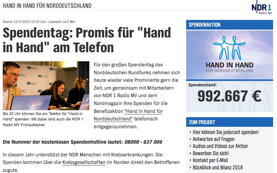 Wir möchten unseren Lesern heute die alljährliche Spendenaktion des NDR „Hand in Hand“ ans Herz legen. In diesem Jahr gehen die Spenden – 1:1, also ohne Abzüge – an die Krebsgesellschaften in Norddeutschland.