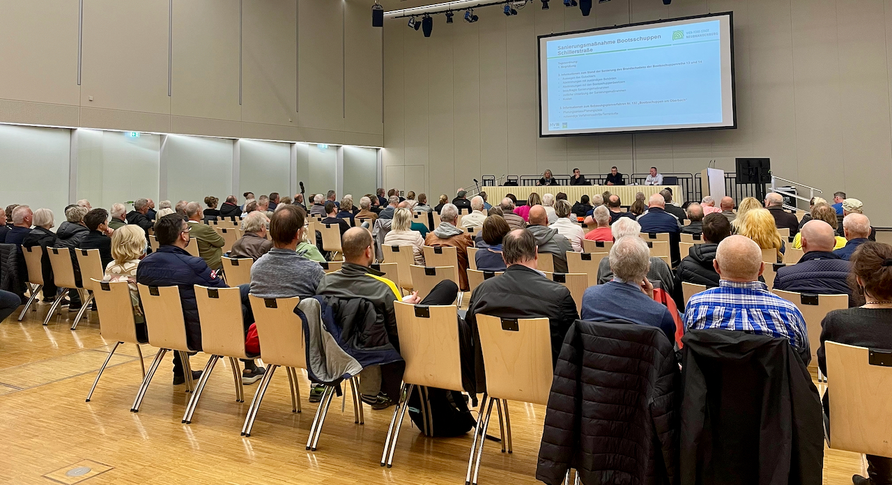 Die Vier-Tore-Stadt hat gestern Abend in einer Informationsveranstaltung über den Stand der Sanierung des Brandschadens der Bootsschuppenreihen 13 und 14 am Neubrandenburger Oberbach sowie das notwendige Bebauungsplanverfahren zur Schaffung von Baurecht informiert. Diese Veranstaltung ist der Auftakt einer Serie weiterer Termine, die den Austausch mit den Pächtern ermöglichen soll. Unter den rund 120 Teilnehmern waren gestern Abend zudem auch Mitglieder der Stadtvertretung Neubrandenburg sowie weitere Interessierte.