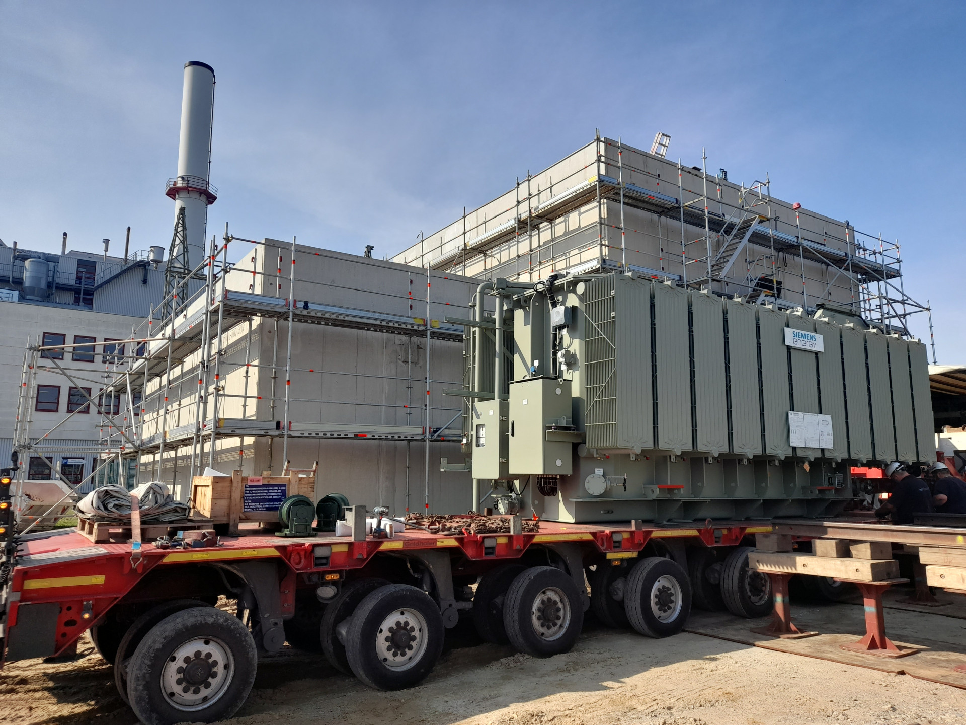 Die Neubrandenburger Stadtwerke (neu.sw) setzen den begonnenen Weg der grünen Wärmewende fort. Jetzt ist der riesige Netztransformator für die im Bau befindliche Power-to-Heat-Anlage (PtH) eingetroffen. Der rund 70 Tonnen schwere Trafo wandelt später überschüssigen grünen Strom um und gibt ihn an die insgesamt drei Elektrodenkessel der PtH weiter. Diese sieben Meter hohen Kessel stehen bereits seit Mai in der Pumpenhalle neben dem Kurzzeitwärmespeicher auf dem Gelände des Gas- und Dampfturbinenheizkraftwerkes (GuD). Sie sind die Kernelemente der Power-to-Heat-Anlage.