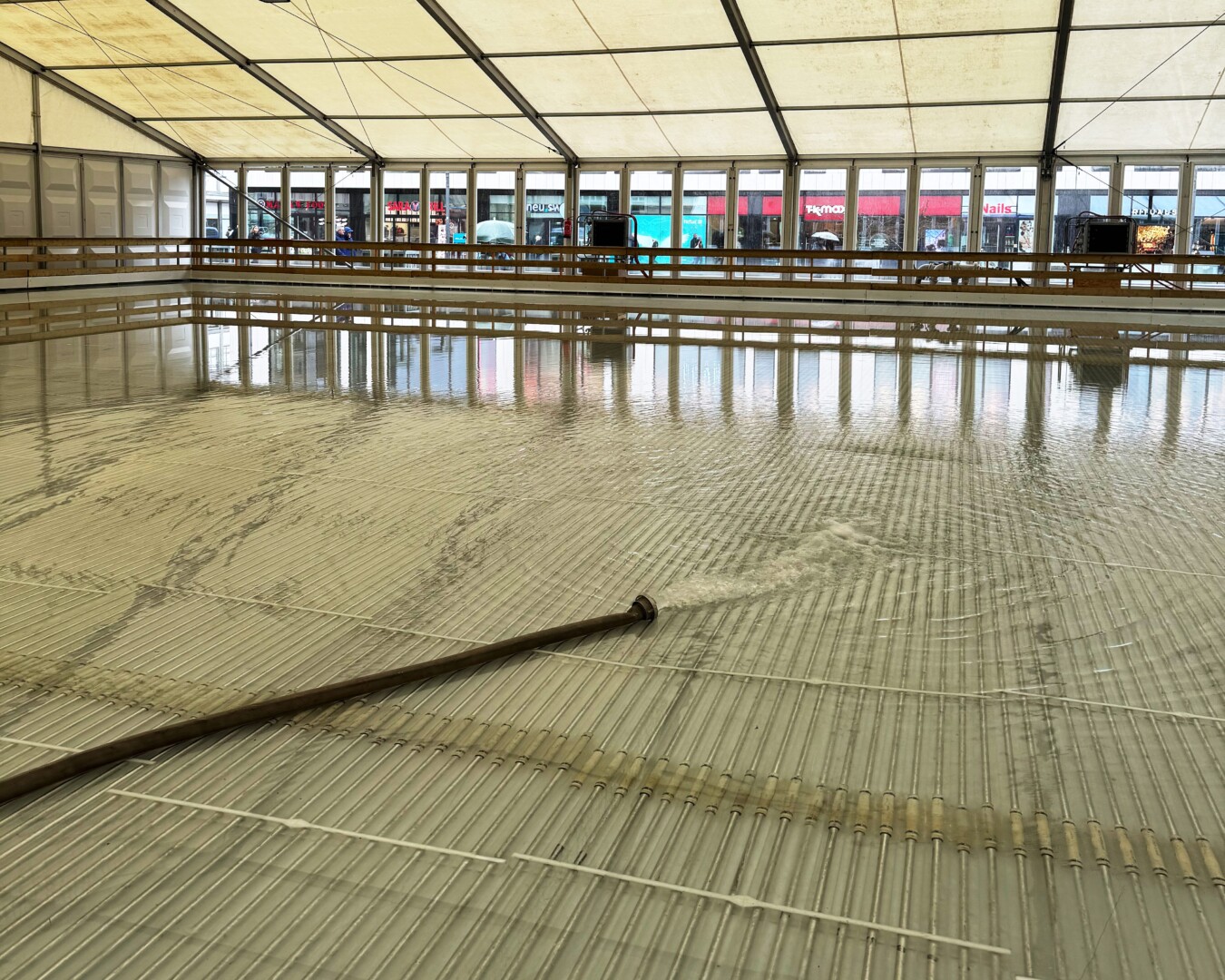 In der neu.sw Eislaufhalle hat der Eisaufbau begonnen. Rund 85 000 Liter Wasser fließen dazu nach und nach per Wasserschlauch auf die 800 Quadratmeter große Eislauffläche und gefrieren dann innerhalb der nächsten drei bis vier Tage zu Eis. Dafür sorgt ein faltbares Kühlsystem, das zuvor ausgelegt wurde.
