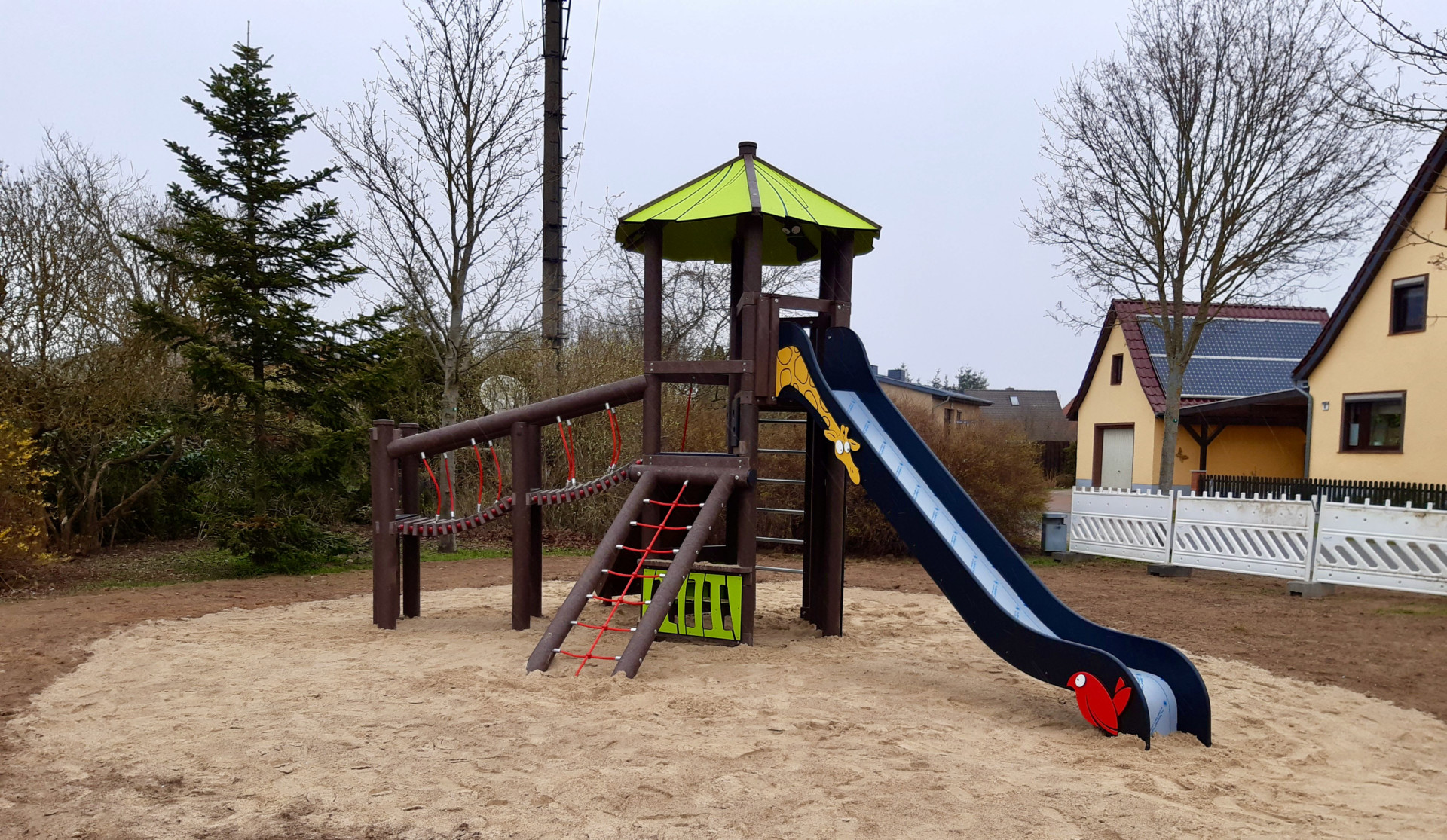 Nun wurde der Spielplatz mit zwei weiteren Geräten ergänzt. Dabei handelt es sich um einen überdachten, sechseckigen Turm mit verschiedenen Aufstiegsmöglichkeiten, wie zum Beispiel eine Hängebrücke und eine Rutsche. Außerdem gibt’s jetzt auch eine Wippe.