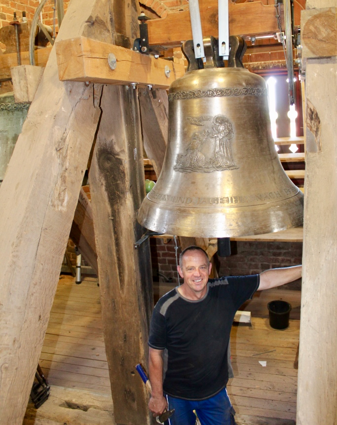 Es erwies sich als nicht ganz einfach, die alten Glocken vom Kirchturm herunter zu bekommen. Für Udo Griwahn vom Turmuhren- und Läuteanlangenbau Grimmen und seinen Mitarbeiter war das ein hartes Stück Arbeit, bei der immer wieder unerwartete Probleme gelöst werden mussten. Denn die Glocken wurden im Turm heruntergelassen und aufgezogen. Was einfach klingt, war mitunter sehr knifflig. Denn im Turm stehen auch noch Holztreppen, eine historische Uhr und der Blasebalg der Orgel. Da konnte man die Glocken nicht einfach gerade herunterlassen.