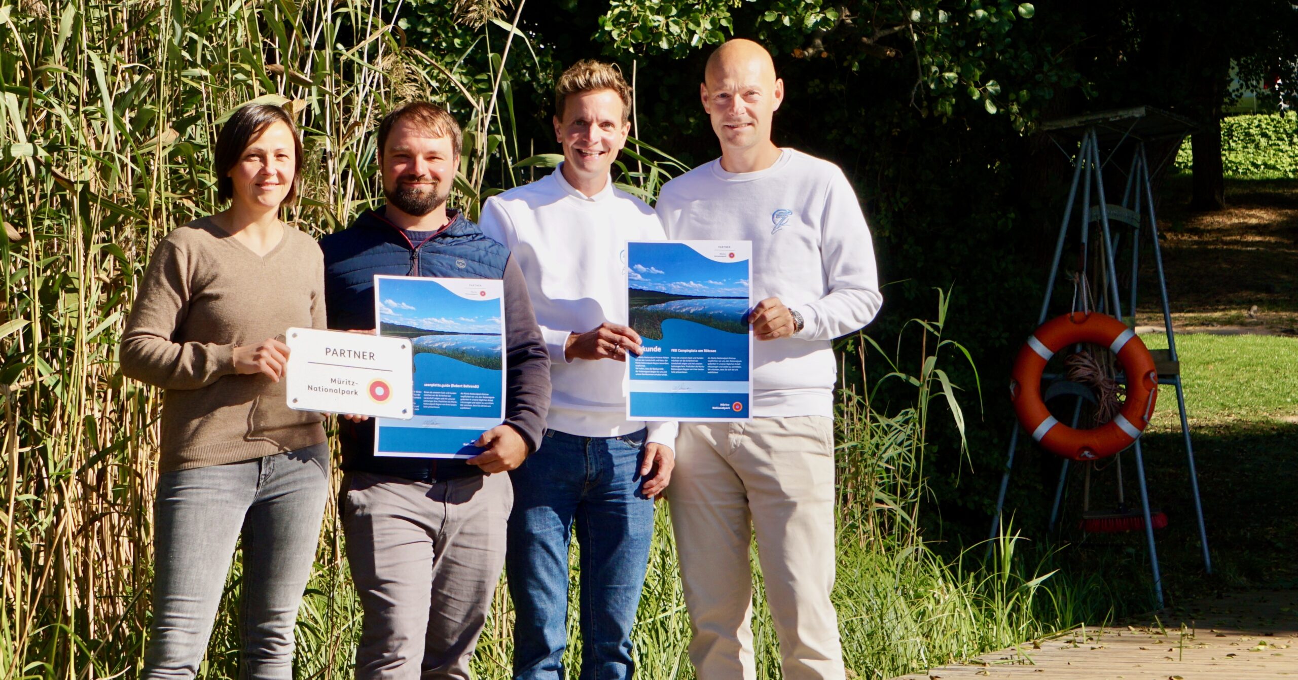 Bild: Neue Nationalpark-Partner: Nationalpark-Mitarbeiterin Therese Thümmler mit Robert Behrendt, Inhaber seenplatte.guide Touren & Services sowie Fabian Heuel und Dr. Martin Löser, Geschäftsführer FKK Campingplatz am Rätzsee (von links).