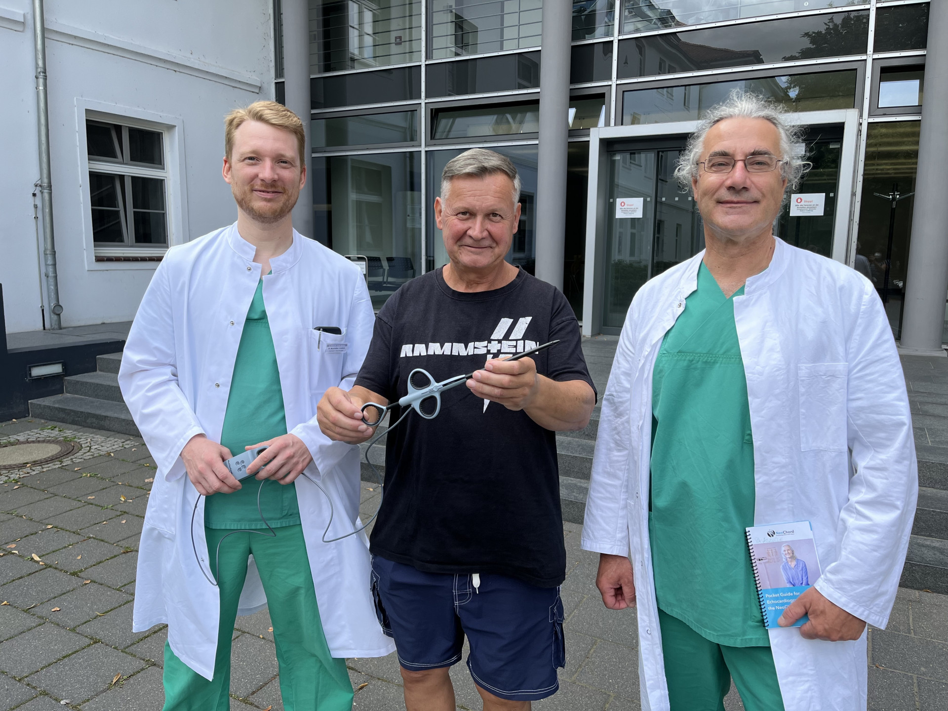 Inzwischen hat das Karlsburger Team zwei Patienten mit der Neochord-Methode erfolgreich behandelt. Eine Woche nach seiner Herzoperation lief der Neustrelitzer Wolfgang Jäkel (62/Foto unten) nahezu unbeschwert den Krankenhausflur im Klinikum Karlsburg entlang. Er konnte es kaum erwarten, die Heimreise mit dem Taxi anzutreten. Nur noch die Naht sei zu spüren. „Im Frühsommer hatte ich starke Atembeschwerden und war so richtig kaputt. Zunächst dachte ich an eine Allergie, aber mein Hausarzt hat schnell auf das Herz getippt“, erzählte Jäkel.