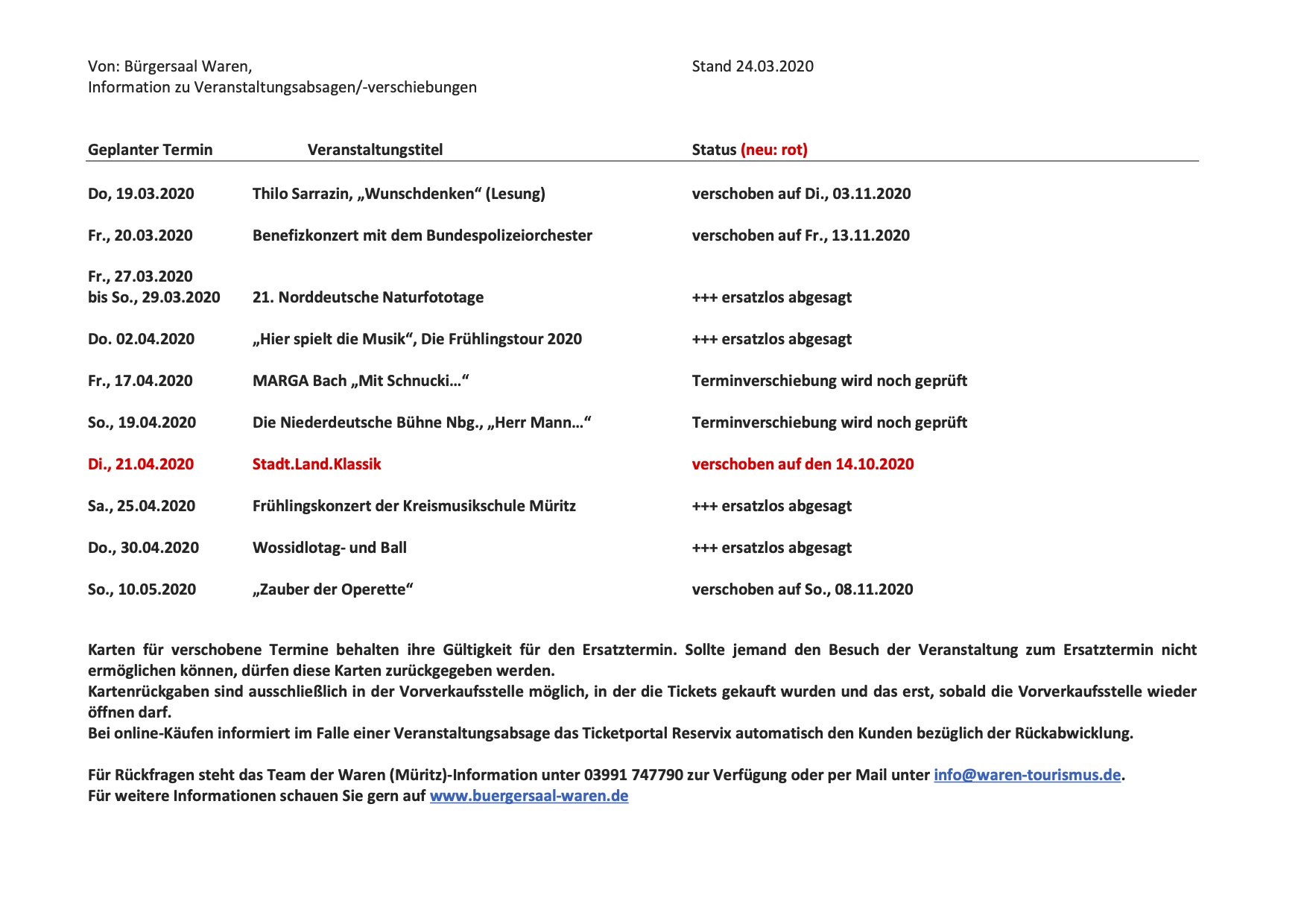 Wie bereits mehrfach berichtet, ist auch der Warener Bürgersaal geschlossen, zahlreiche Veranstaltungen wurden abgesagt. Inzwischen gibt es für einige Veranstaltungen bereits neue Termine.