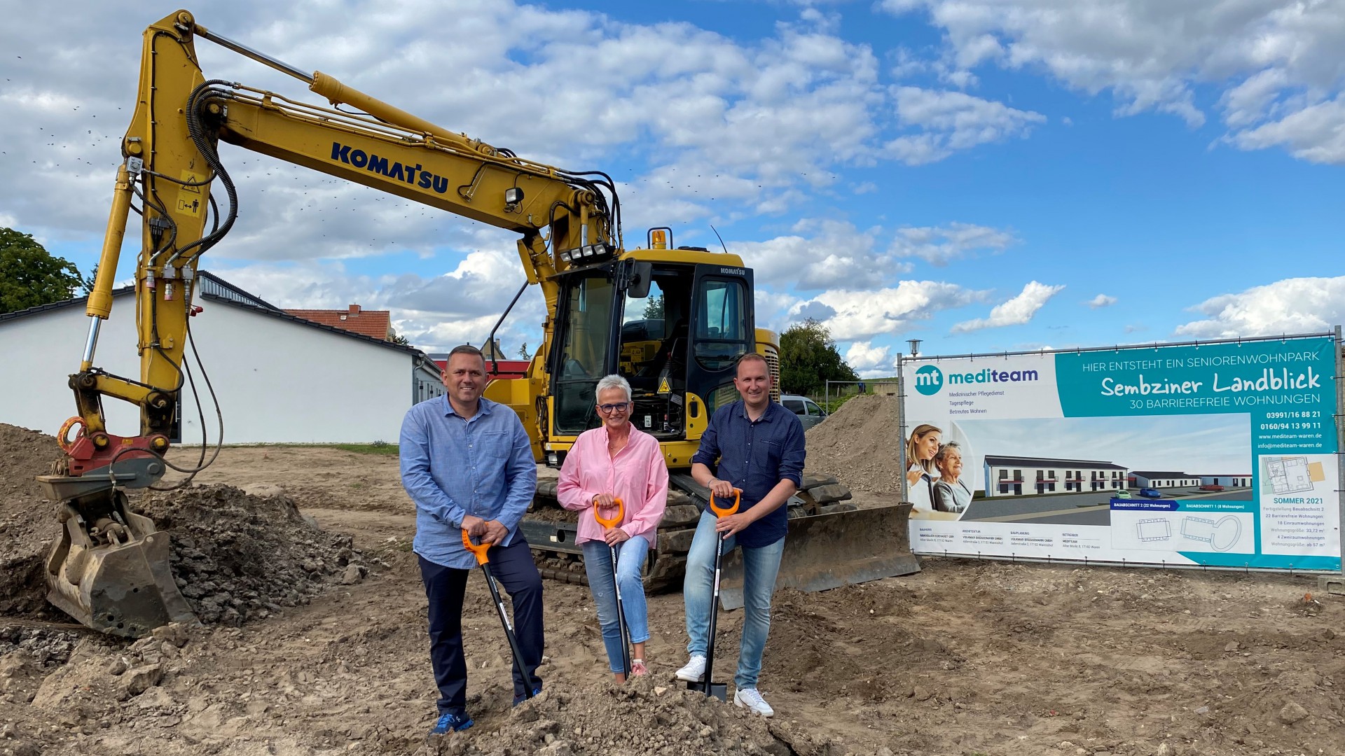 Der Warener Pflegedienst Mediteam ist seit vielen Jahren aktiv im Einsatz, um zahlreiche Patienten in Waren und in der näheren Umgebung individuell und professionell in familiärer Umgebung zu pflegen. Seit gut eineinhalb Jahren gehört auch der „Sembziner Landblick“ im Klinker Ortsteil Sembzin mit acht barrierefreien Wohnungen und Tagespflege für 24 Tagesgäste zum Unternehmen. Und der soll jetzt wachsen: Anfang dieser Woche hat Renate Eckhardt mit ihren Söhnen Thino (links) und Christoph den ersten Spatenstich für den zweiten Bauabschnitt im Seniorenwohnpark vorgenommen.