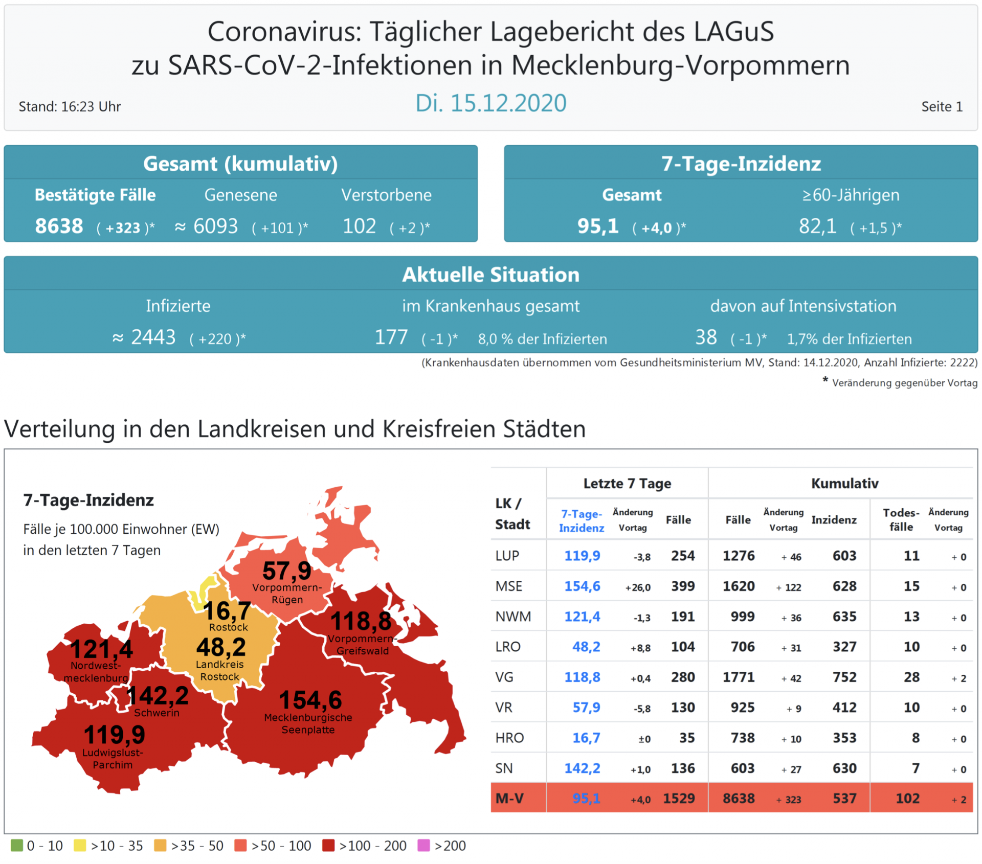 Insgesamt wurden in Mecklenburg-Vorpommern bisher 8638 Infektionen festgestellt. Im Land gab es bislang 102 Todesfälle, zwei mehr als gestern.