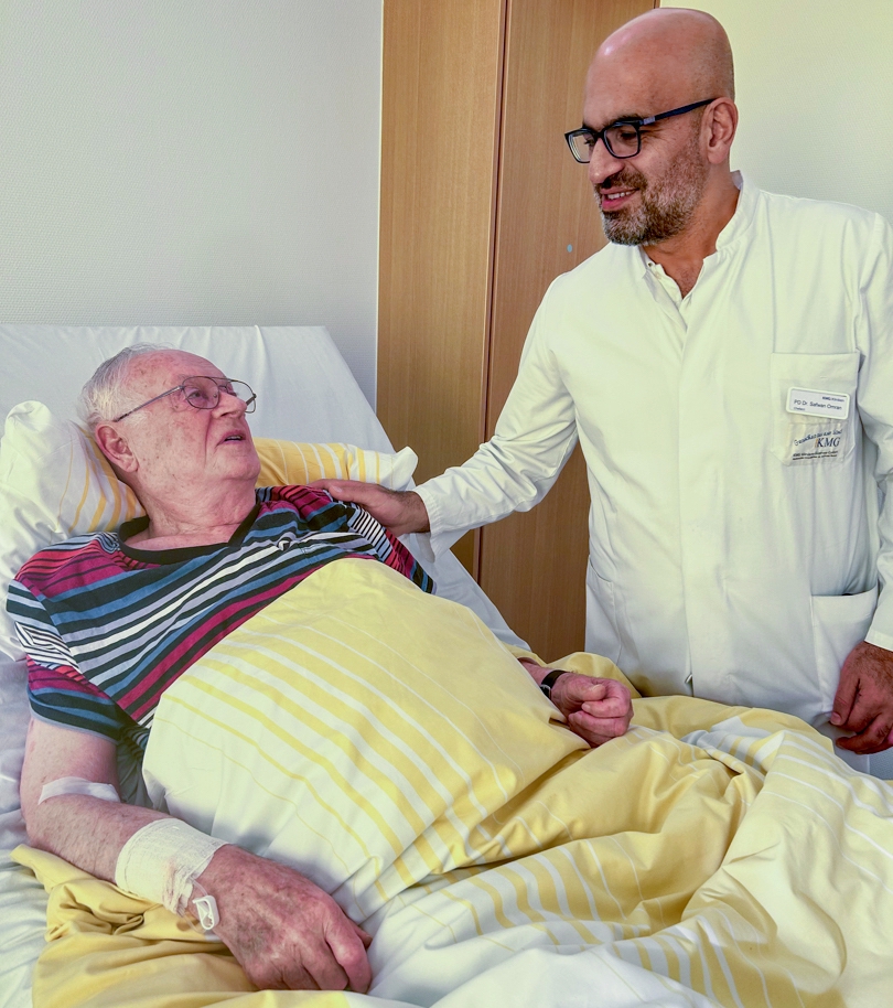 Mitte Oktober hat PD Dr. Safwan Omran, Chefarzt der Klinik für Gefäßchirurgie, die erste fenestrierte Aortenstent-Implantation am KMG Klinikum Güstrow erfolgreich durchgeführt. Diese komplexe Operation an der Aorta, also der Hauptschlagader, ist ein besonders schonendes Verfahren zur Behandlung eines Aortenaneurysmas. Ein Aortenaneurysma ist eine gefährliche Erweiterung der Hauptschlagader, weil die Aorten-Wand an Elastizität und Stabilität verloren hat. Ohne Behandlung besteht die Gefahr einer Ruptur – eines Risses – der zum Tod führen kann.