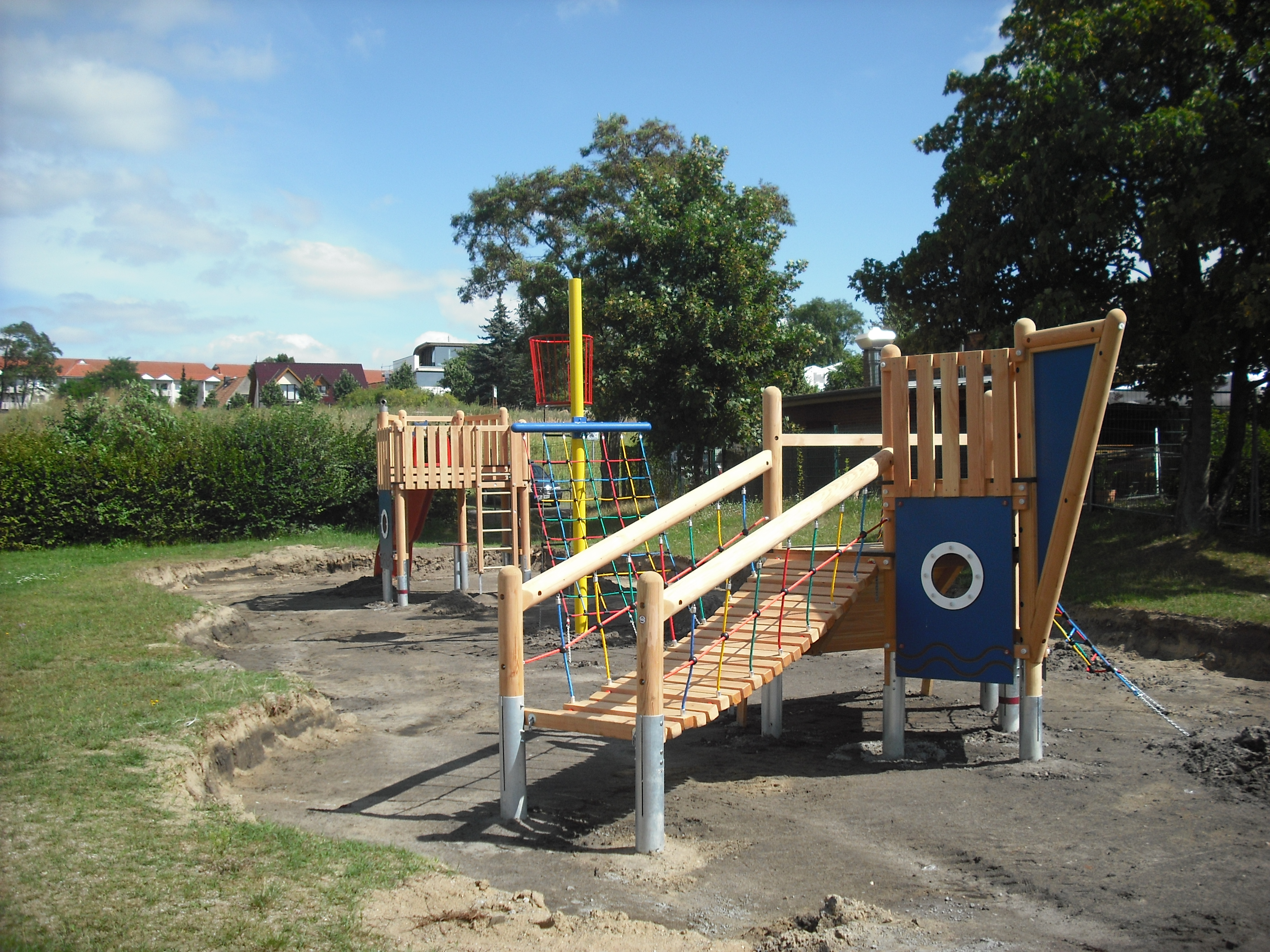 Zurzeit laufen noch die letzten Baumaßnahmen. Wenn die Fundamente des diesmal aus Edelhölzern bestehenden Schiffes abgetrocknet sind, wird der Kies eingebracht. Man hat sich bewusst für Edelhölzer entschieden, da ihre Haltbarkeit mit 15 – 20 Jahren garantiert wird, was bei der alten Variante (Kesseldruckimprägnierung) nur bei 5 – 10 Jahren lag. Weiterhin ist geplant, die Einfassung des Spielplatzes aus Holzpalisaden zu gestalten, die gleichzeitig als Sitzgelegenheit für die Eltern dienen.