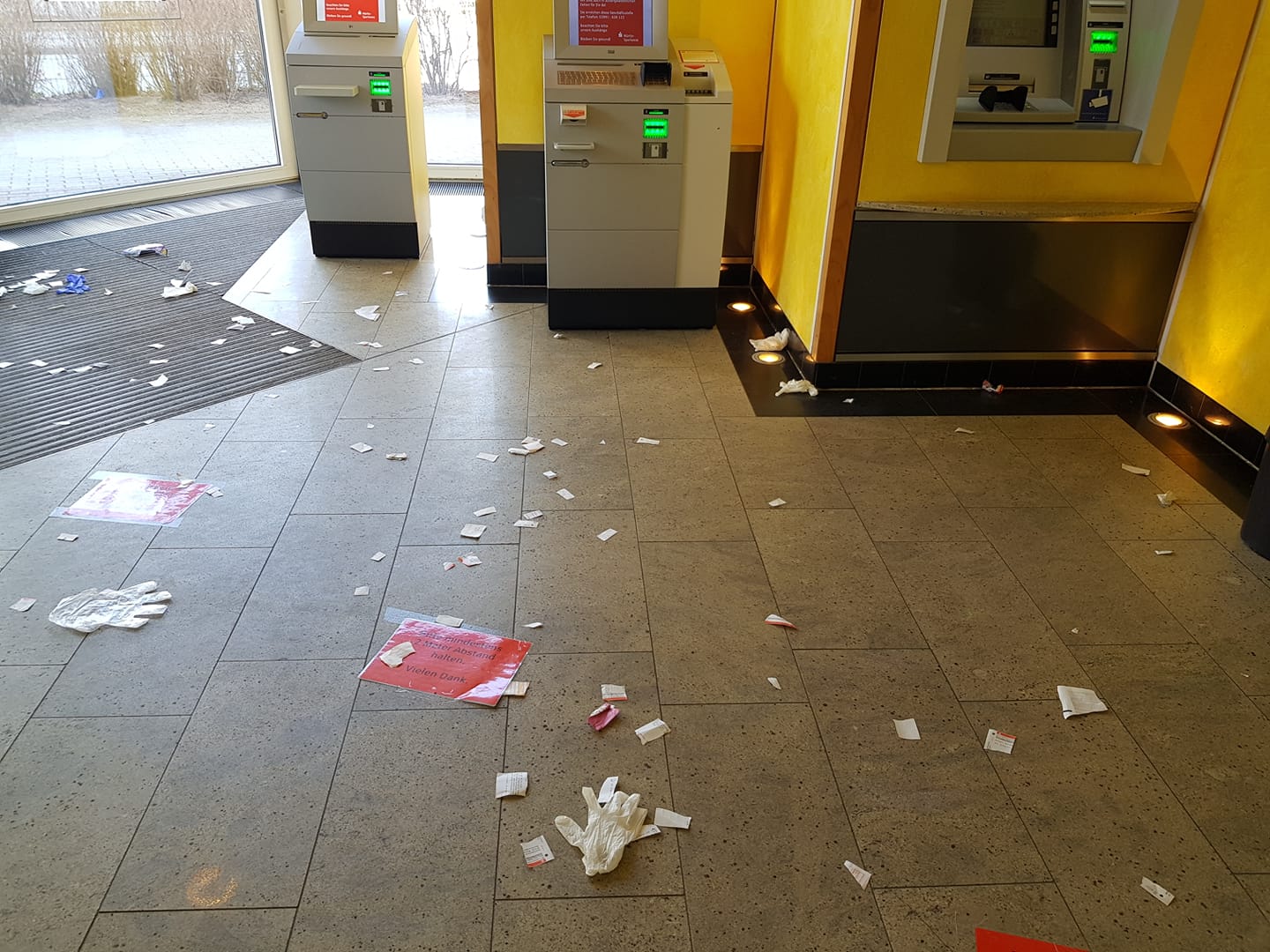 Muss das sein? So sah’s gestern im Selbstbedienungsraum der Müritz-Sparkasse in Waren-West aus. Außerdem erreichen uns immer mehr Bilder mit weggeworfenen Gummihandschuhen vor Supermärkten. Wenn sich jeder mal ein bisschen am Riemen reißen würde, wäre es für alle leichter, vor allem für diejenigen, die diesen Dreck jetzt wegmachen müssen.