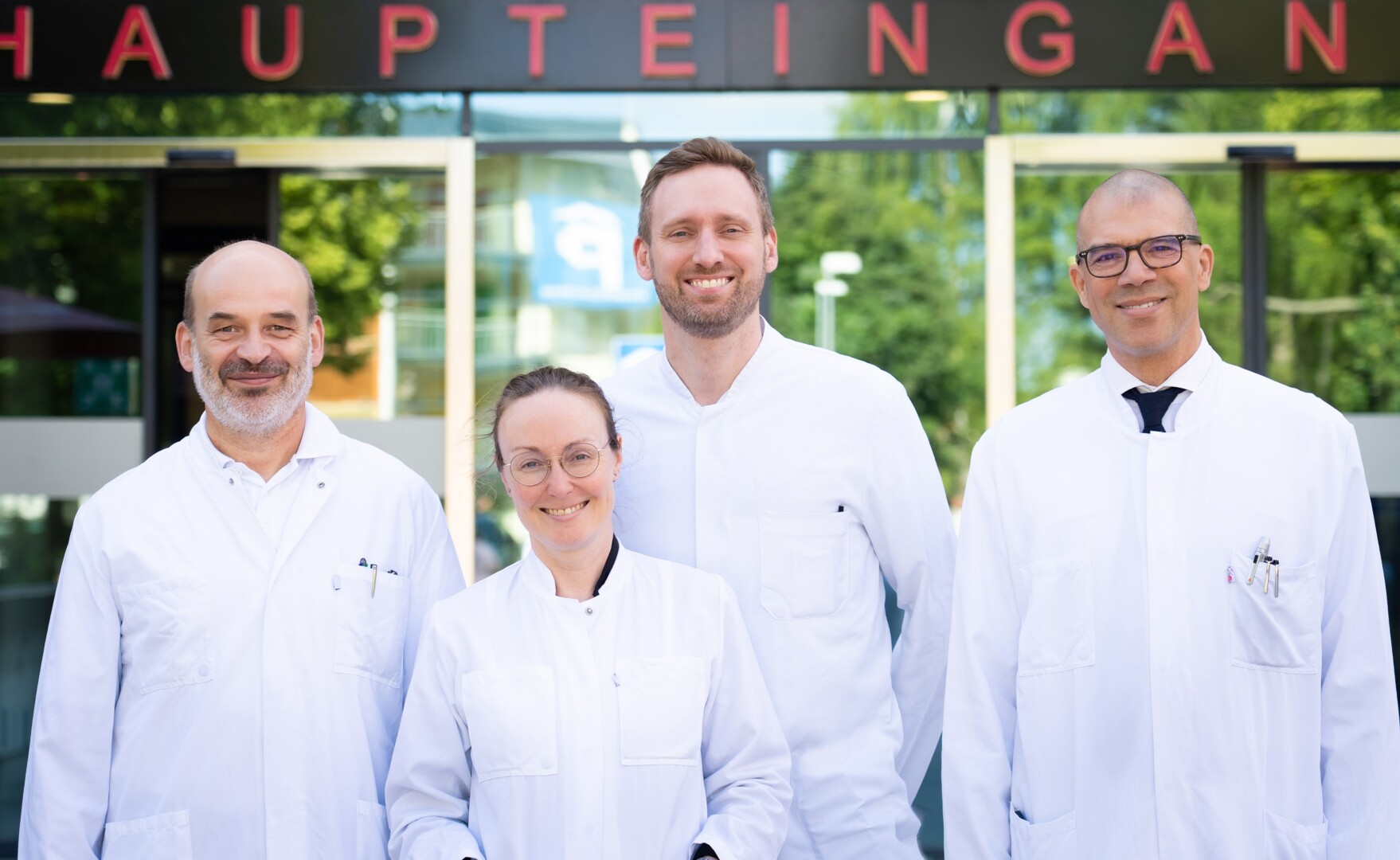 Bild: Freuen sich über die Erstzertifizierung von drei weiteren Organkrebszentren: Prof. Dr. Guido Hildebrandt (v.l.), Direktor der Klinik und Poliklinik für Strahlentherapie und Sprecher des Onkologischen Zentrums, Prof. Dr. Angelika Borkowetz, Direktorin der Klinik und Poliklinik für Urologie, Prof. Dr. Dr. Florian Geßler, Sprecher des Neuroonkologischen Zentrums und Prof. Dr. Dr. Thomas M. Freiman, Direktor der Klinik und Poliklinik für Neurochirurgie.