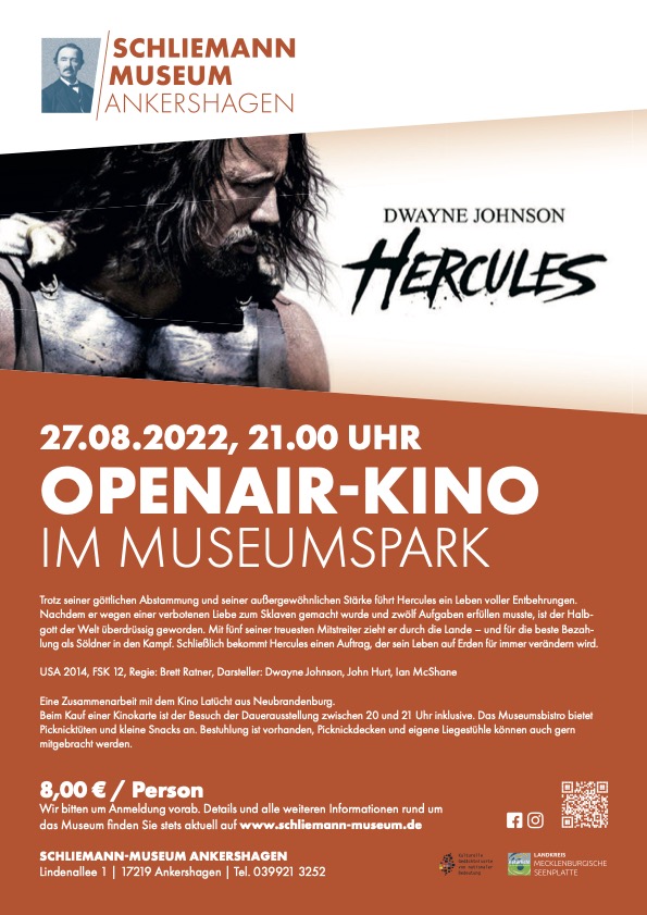 Der Garten des Heinrich-Schliemann-Museums Ankershagen wird am kommenden Sonnabend, 27. August, wieder zum Kinosaal. Ab 21 Uhr wir der Film „Hercules“ gezeigt.
