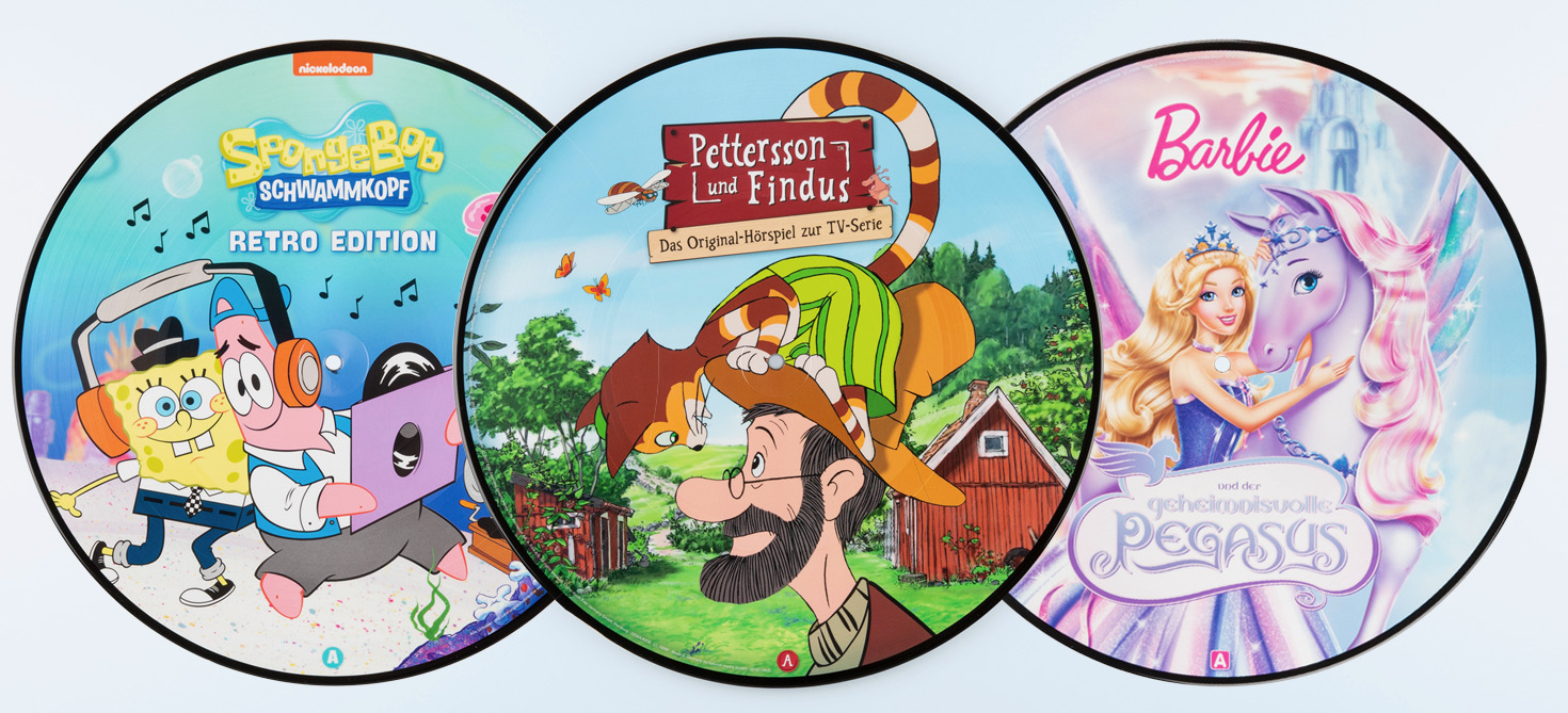 Diese Schallplatten sind in limitierter Auflage in Form von sehenswerten, farbenprächtigen Picture Vinylen mit Motiven von „Pettersson und Findus“, „Spongebob“ und „Barbie“ erschienen. Verpackt sind alle drei in liebevoll gestalteten Klappalben. Alle Schallplatten enthalten verschiedene Hörspiele, die Ausgabe der „Pettersson und Findus“-Platte bietet außerdem noch zwei Musiktitel und hat ein Poster beigelegt.