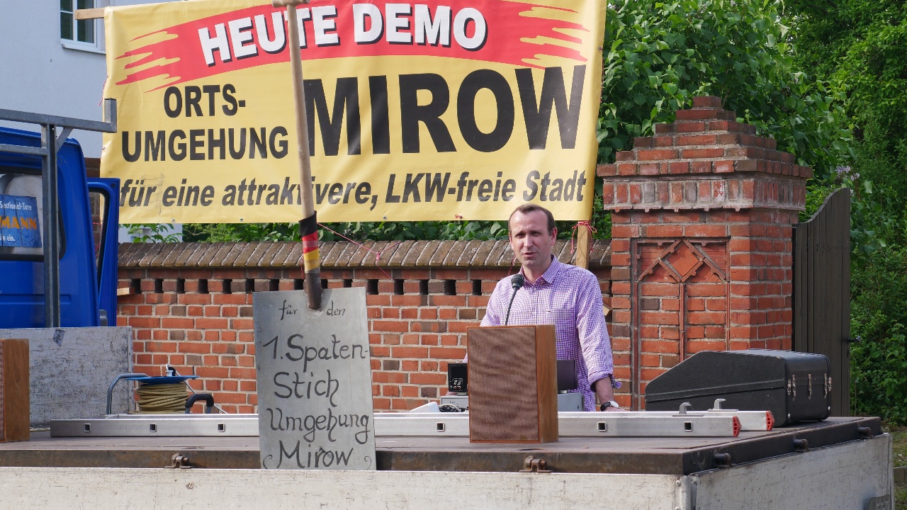 Die Bürgerinitiative Umgehungsstraße Mirow e.V. hat gestern nach mehrmonatiger Corona- Pause ihre regelmäßigen Demonstrationen wieder auf genommen. Stephan Bunge – Bundestagskandidat der CDU im Wahlkreis 17 – sicherte den mehr als 50 Anwesenden seine Unterstützung zu: „Wie ein malerischer Ort im Verkehr erstickt, kann man seit vielen Jahren in Mirow beobachten, wo sich die Lkw auf dem Weg zur A19 durch die engen Straßen mühen. Seit Jahren wird geplant, das Projekt ist im Bundesverkehrswegeplan enthalten, das Geld ist bewilligt. Trotzdem behinderten Planungsmängel und laufende Gerichtsverfahren den Baustart.“