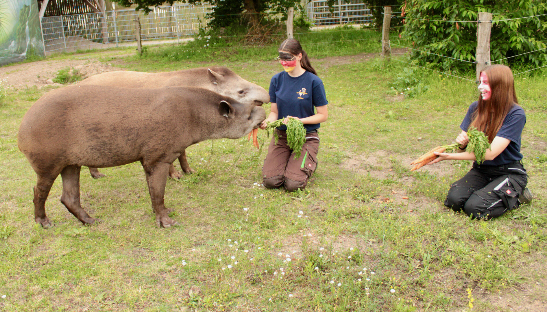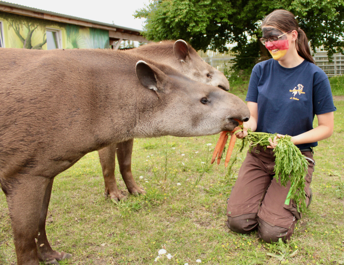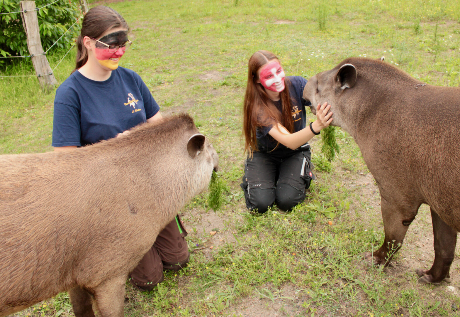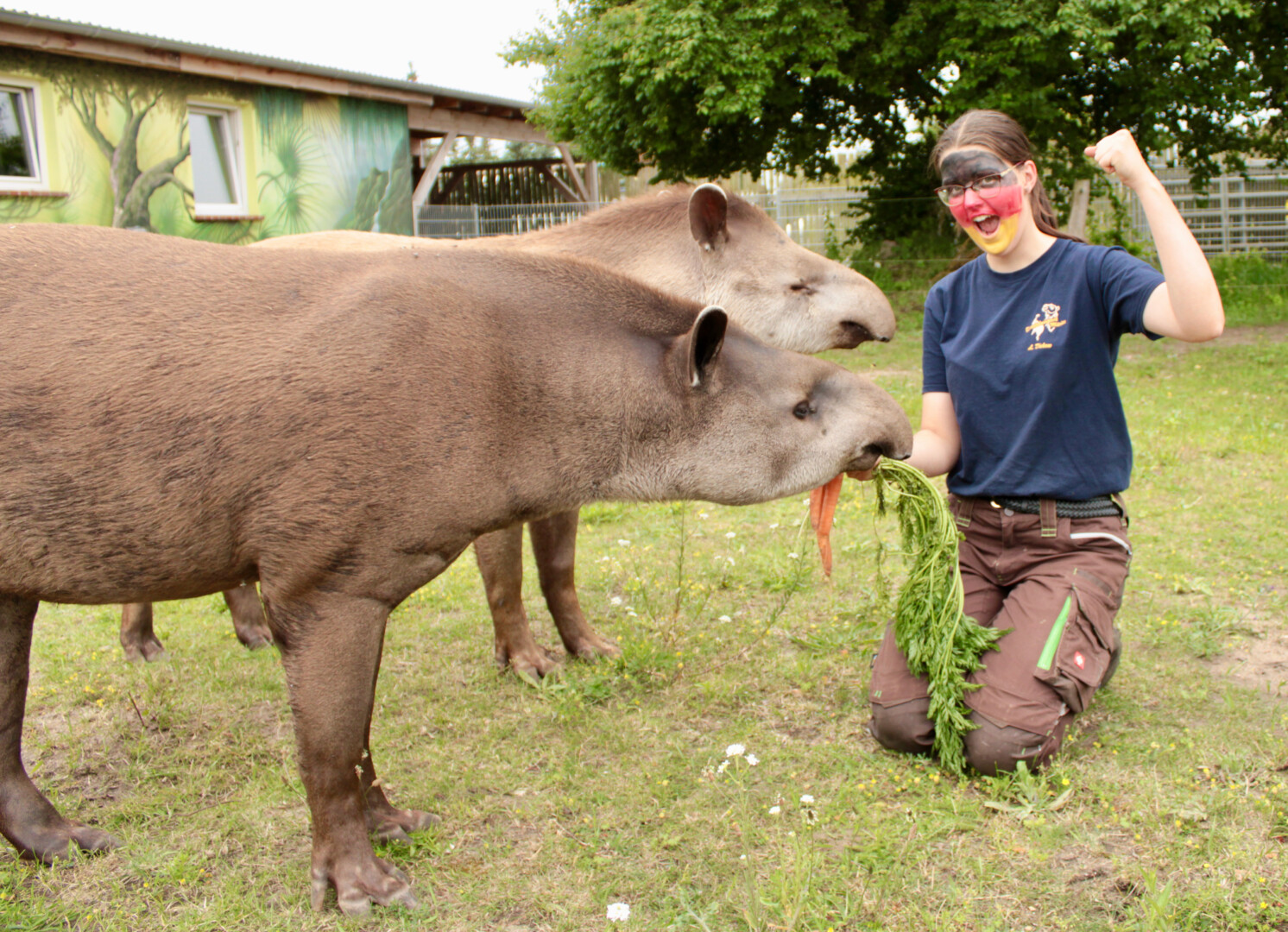 Keine Sorge, kann nichts schief gehen in wenigen Minuten beim dritten Gruppenspiel der deutschen EM-Mannschaft: Das Team des Tiererlebnisparkes Müritz in Grabowhöfe hatte heute bei der Befragung der Orakel Pablo und Miriam sehr viel Freude und ist ganz zuversichtlich. Die Azubis Swenja Petersohn (Schweiz) und Lana Dickow (Deutschland) haben es sich nicht nehmen lassen, die Befragung der putzigen Tapire selbst durchzuführen. Statt der obligatorischen Fahnen und Körbe wurden sie mit bester Karnevals-Schminke in Szene gesetzt – Kassen-Dame Marita hatte extra ihren Dachboden durchsucht, bis sie schließlich fündig wurde.