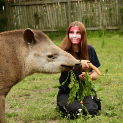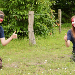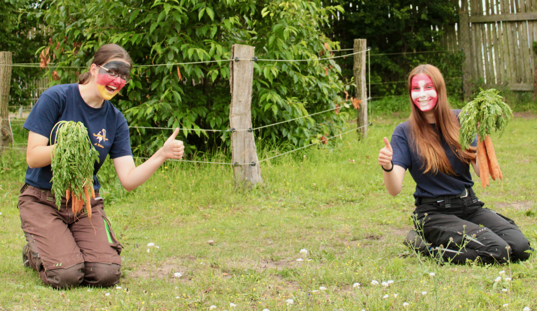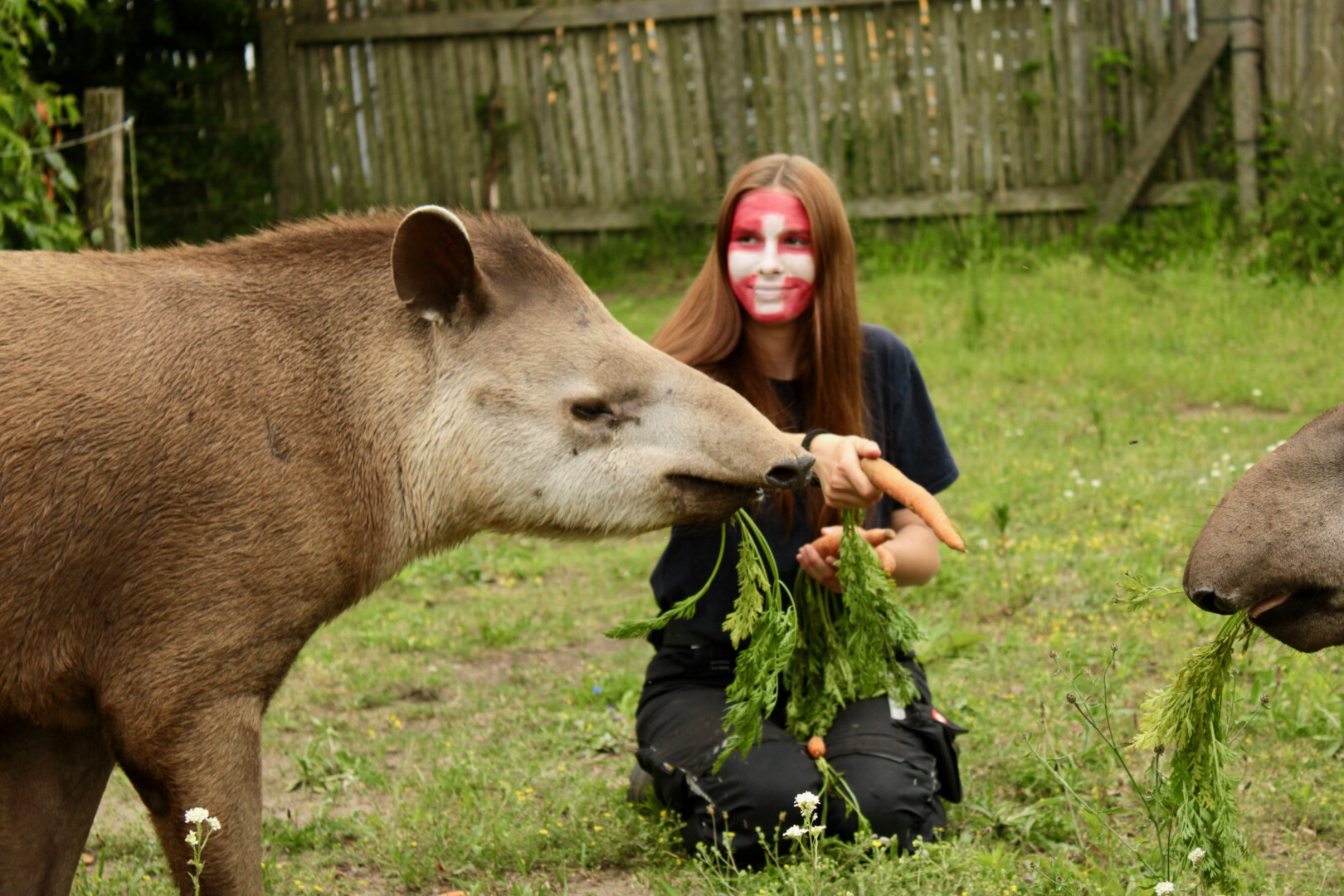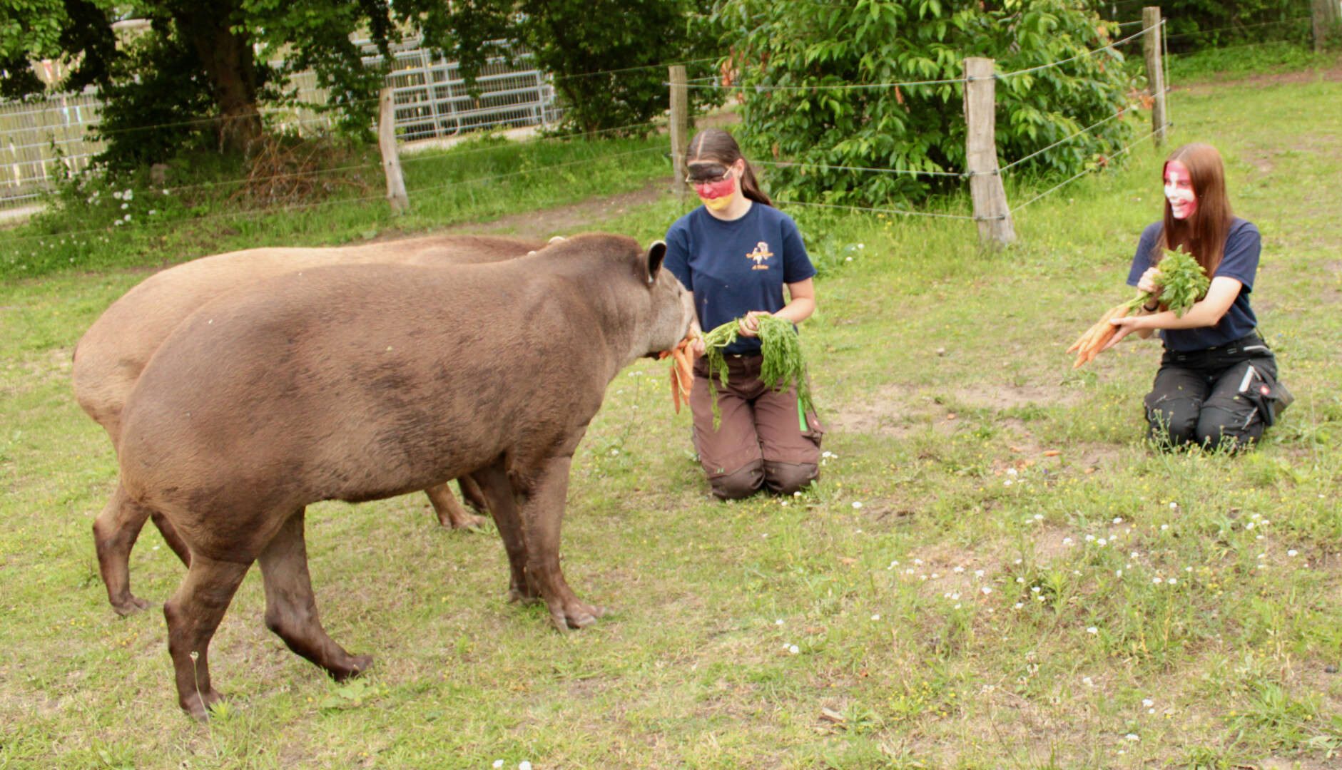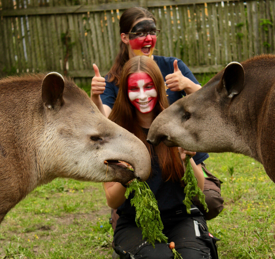 Keine Sorge, kann nichts schief gehen in wenigen Minuten beim dritten Gruppenspiel der deutschen EM-Mannschaft: Das Team des Tiererlebnisparkes Müritz in Grabowhöfe hatte heute bei der Befragung der Orakel Pablo und Miriam sehr viel Freude und ist ganz zuversichtlich. Die Azubis Swenja Petersohn (Schweiz) und Lana Dickow (Deutschland) haben es sich nicht nehmen lassen, die Befragung der putzigen Tapire selbst durchzuführen. Statt der obligatorischen Fahnen und Körbe wurden sie mit bester Karnevals-Schminke in Szene gesetzt – Kassen-Dame Marita hatte extra ihren Dachboden durchsucht, bis sie schließlich fündig wurde.