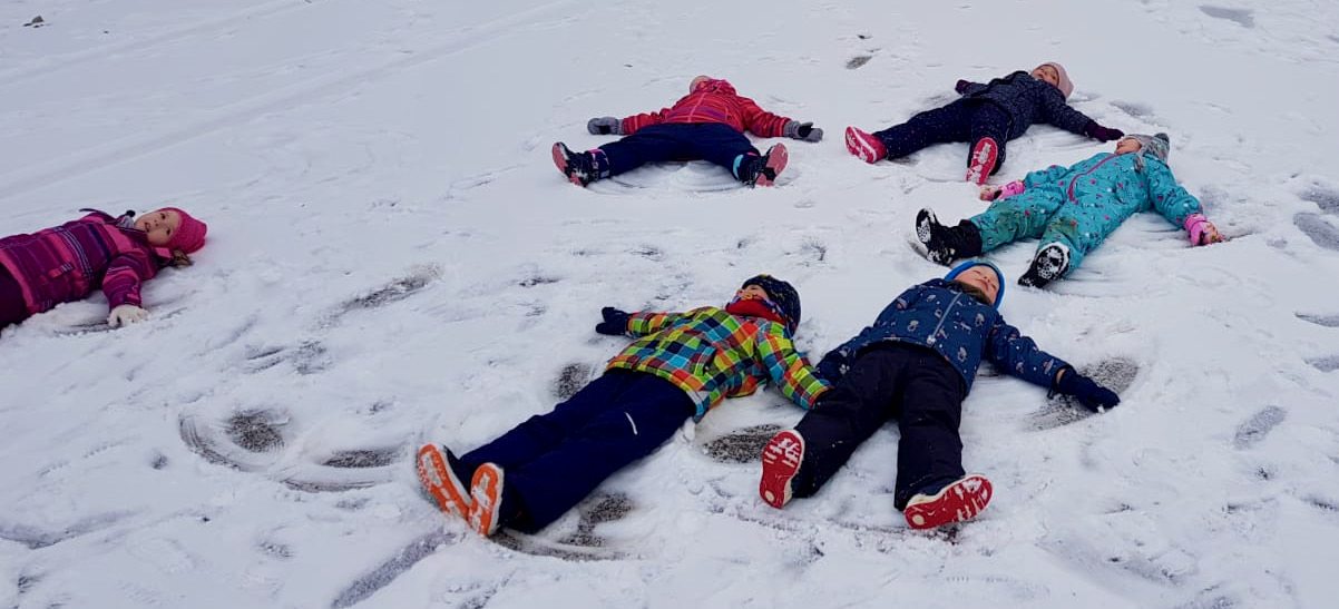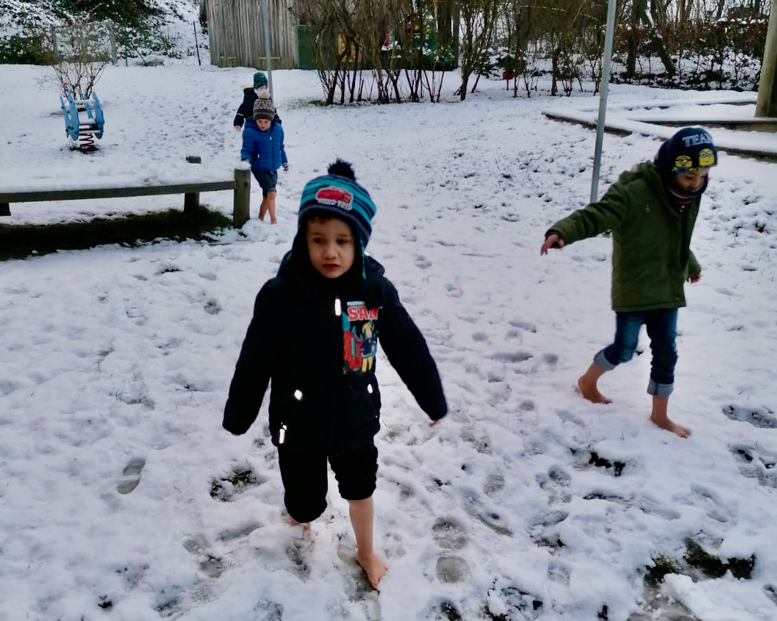 Anfangs noch ängstlich dem Unbekannten gegenüber, werden die Kinder immer „mutiger“ und können nun gar nicht genug von den schuhlosen Ausflügen in den Schnee bekommen.