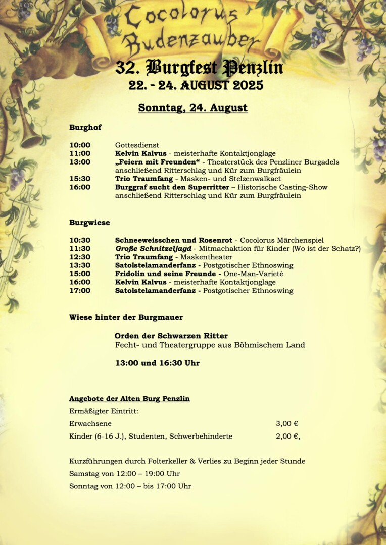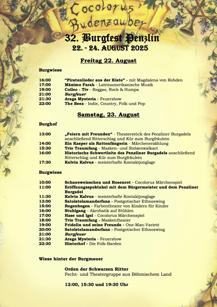 Unter dem Motto „Feiern mit Freunden“ stehen beim 32. traditionellen Burgfest in Penzlin am kommenden Wochenende wieder drei volle Tage – gespickt mit einem bunten und abwechslungsreichen Programm – für Nachwuchsritter und Burgdamen von morgen an. Vom 22. bis 24. August erstreckt sich auf dem historischen Burggelände wieder ein buntes Markttreiben. Es gibt tolle Livebands, mittelalterliche Handwerkskunst, schmackhafte Gaumenfreuden sowie Erfrischungen, und natürlich fehlen auch Darbietungen des Burgadels nicht.