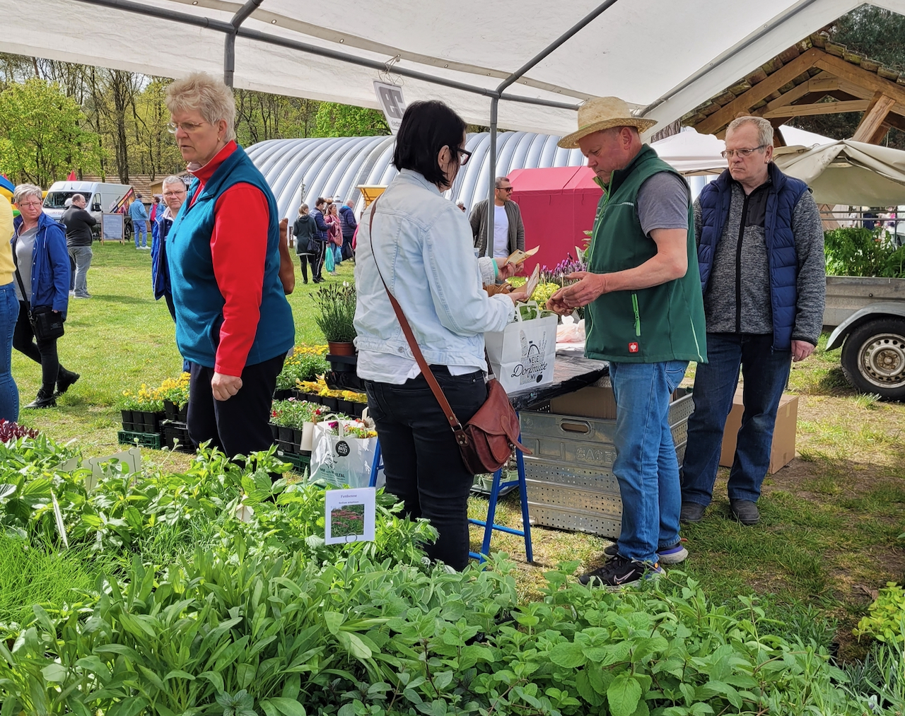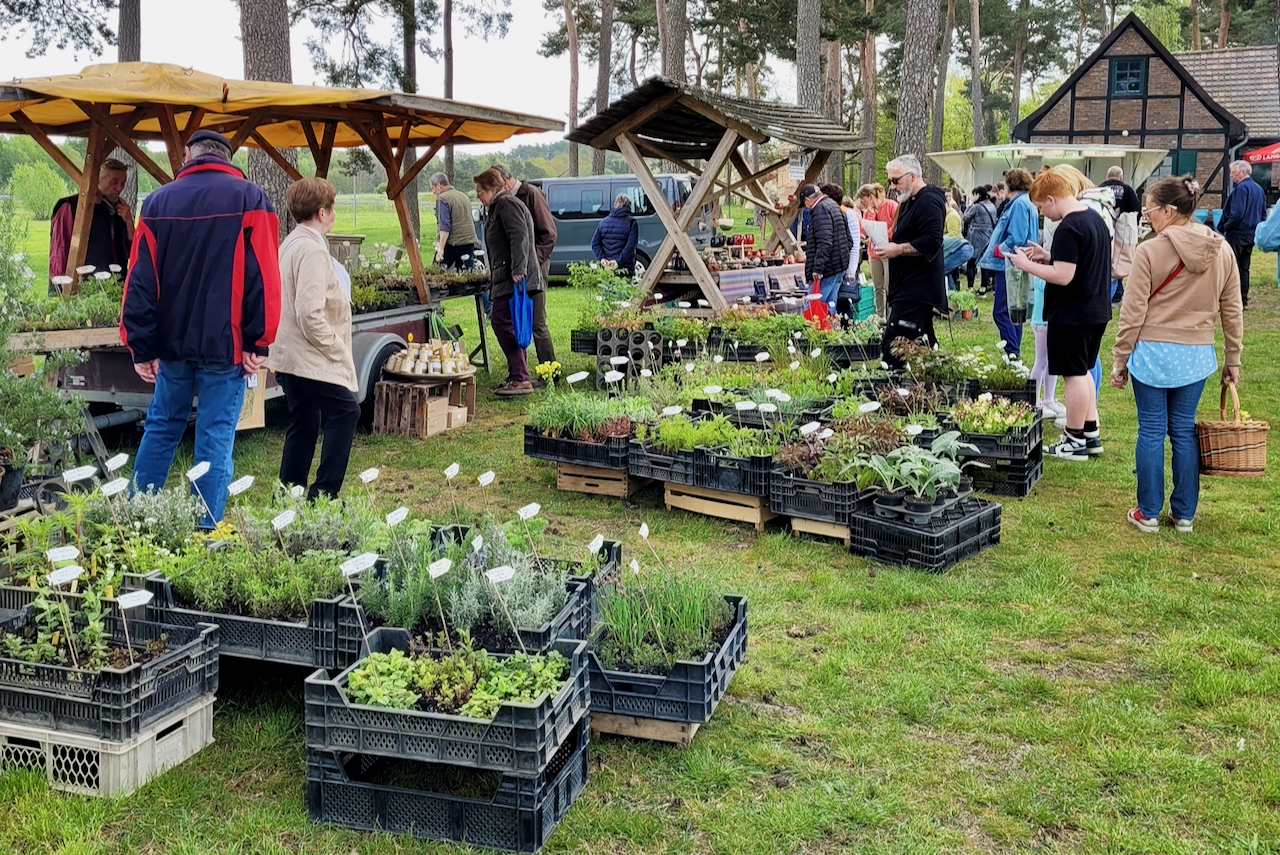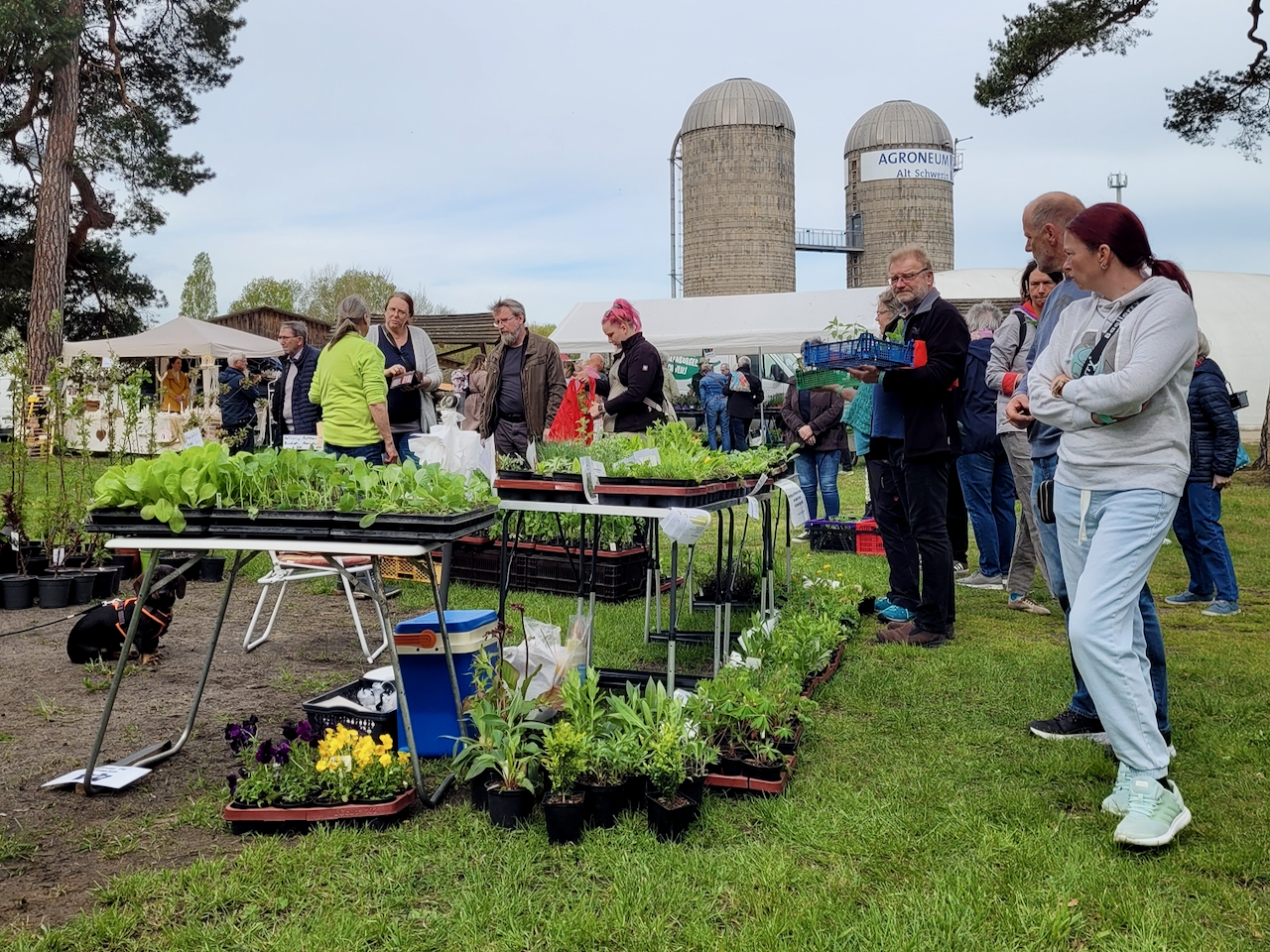 Das Freigelände am Agroneum Alt Schwerin hat sich gestern in einen großen Pflanzen- und Töpfermarkt verwandelt. Bereits vor der offiziellen Öffnung um 10 Uhr standen Hobbygärtner, Pflanzenfreunde und Keramikliebhaber Schlange, um möglichst als Erste aus der großen Vielfalt der mehr als 30 Händler auswählen zu können. Leuchtende Blumen, Kräuter, Heilpflanzen, Gemüse, Obstgehölze und vieles mehr wurden geboten, um die heimischen Gärten zu verschönern oder Obst und Gemüse zur Selbstversorgung anzubauen. Töpfergut, Holz- und Naturdekorationen sowie Accessoires für Haus und Garten rundeten das reiche Angebot an schönen Dingen ab.