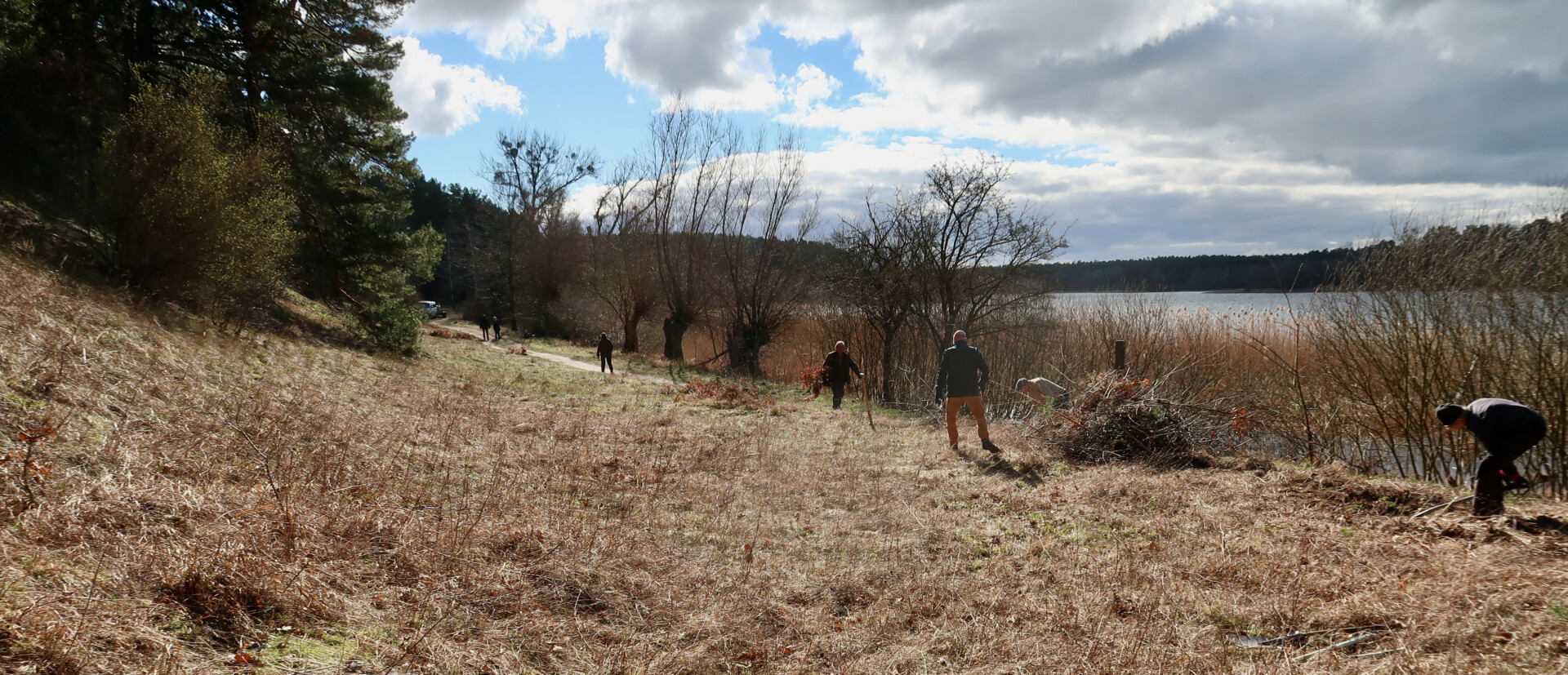 Mitglieder des NABU Regionalverbands Waren Müritz und Mitarbeiter des Nationalparkamtes befreien die Flächen von Mahdgut, Moos und aufkommenden Gehölzen, um Bedingungen zu schaffen, die förderlich für seltene Pflanzenarten wie die Wiesen-Kuhschelle sind.