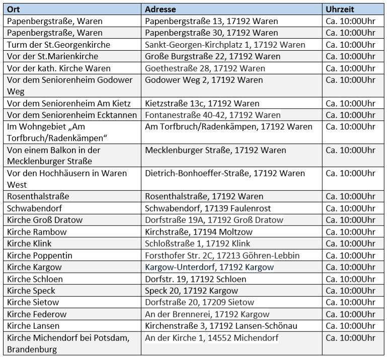 Die Posaunenchöre der Warener St. Marien Gemeinde und St.Georgen-Gemeinde wollen heute auch ohne Gottesdienste in den Kirchen ein bisschen Osterstimmung verbreiten. Ab etwa 10Uhr sind sie an verschiedenen Orten in der Müritz-Region unterwegs und spielen ein paar Osterchoräle.