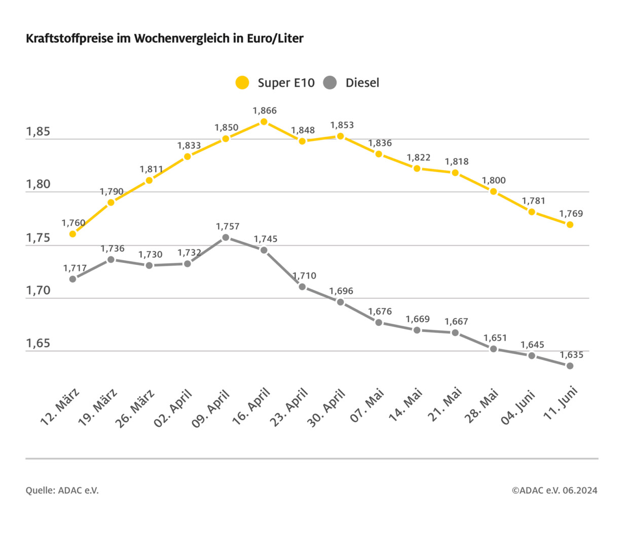 Die Spritpreise sind weiter gesunken. Ein Liter Super E10 kostet im bundesweiten Mittel aktuell 1,769 Euro und damit 1,2 Cent weniger als vor einer Woche. Das zeigt die aktuelle ADAC Auswertung der Kraftstoffpreise in Deutschland. Auch Diesel kann derzeit billiger getankt werden als vor Wochenfrist: Für einen Liter sind 1,635 Euro fällig – ein Minus von einem Cent.