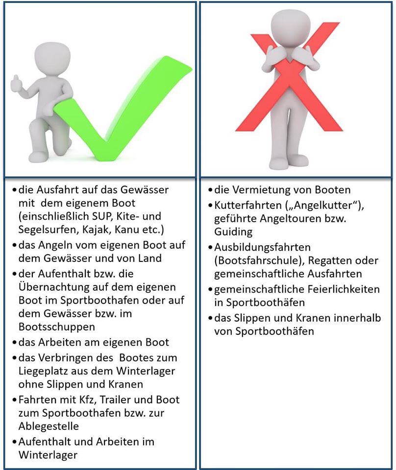 Der Zutritt zu Sportboothäfen ist verboten, aber verantwortlichen Betreiber/Eigentümer sowie Bootseignern dürfen sich dort mit maximal einer weiteren Person beziehungsweise den Angehörigen des gemeinsamen Hausstandes unter Beachtung des Kontaktverbotes aufhalten. Nachfolgend genannte Beispiele sollen verdeutlichen, was unter Beachtung dieses Kontaktverbotes in Sportboothäfen erlaubt ist und welche Aktivitäten nicht gestattet sind.