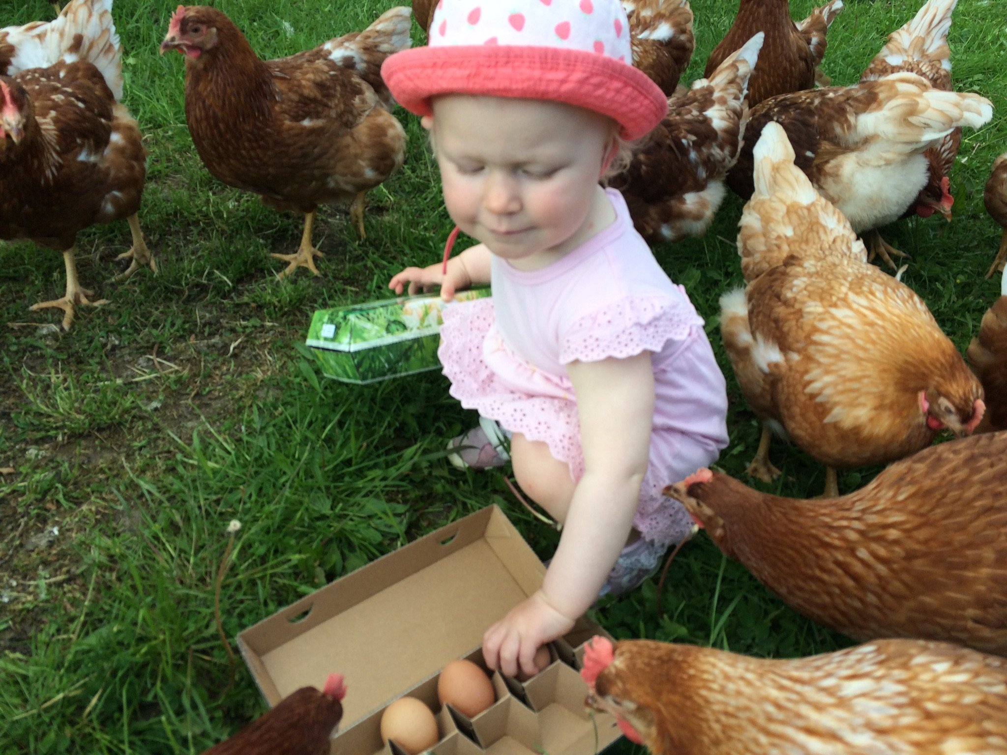 Die Hühner der Knust’s leben wahrlich wie im Schlaraffenland. Ihr Zuhause ist ein mobiler Hühnerwagen, der jede Woche weiter gefahren wird. So haben die Hühner immer frisches Grün und viel Auslauf. Sozusagen campende Hühner.