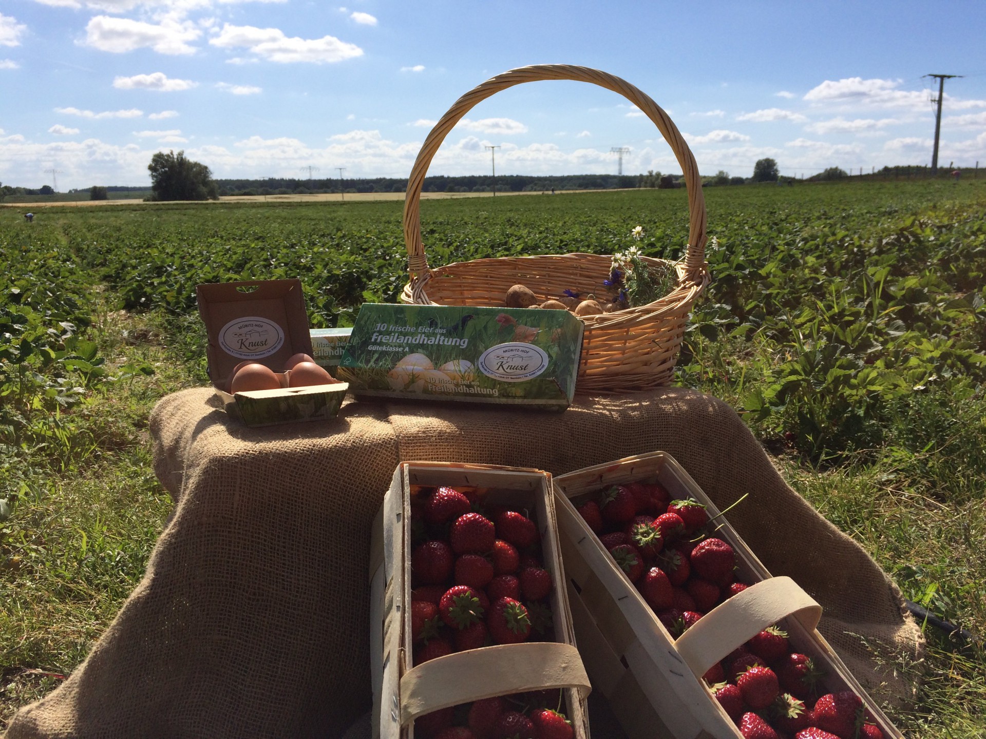 Doch es gibt noch mehr frische Sachen am Erdbeerfeld in Sembzin, nämlich auch die täglich frisch gerodeten Frühkartoffeln sowie die Müritzer Freilandeier – alles im Umkreis von 500 Metern auf eigenen Flächen selbst erzeugt.