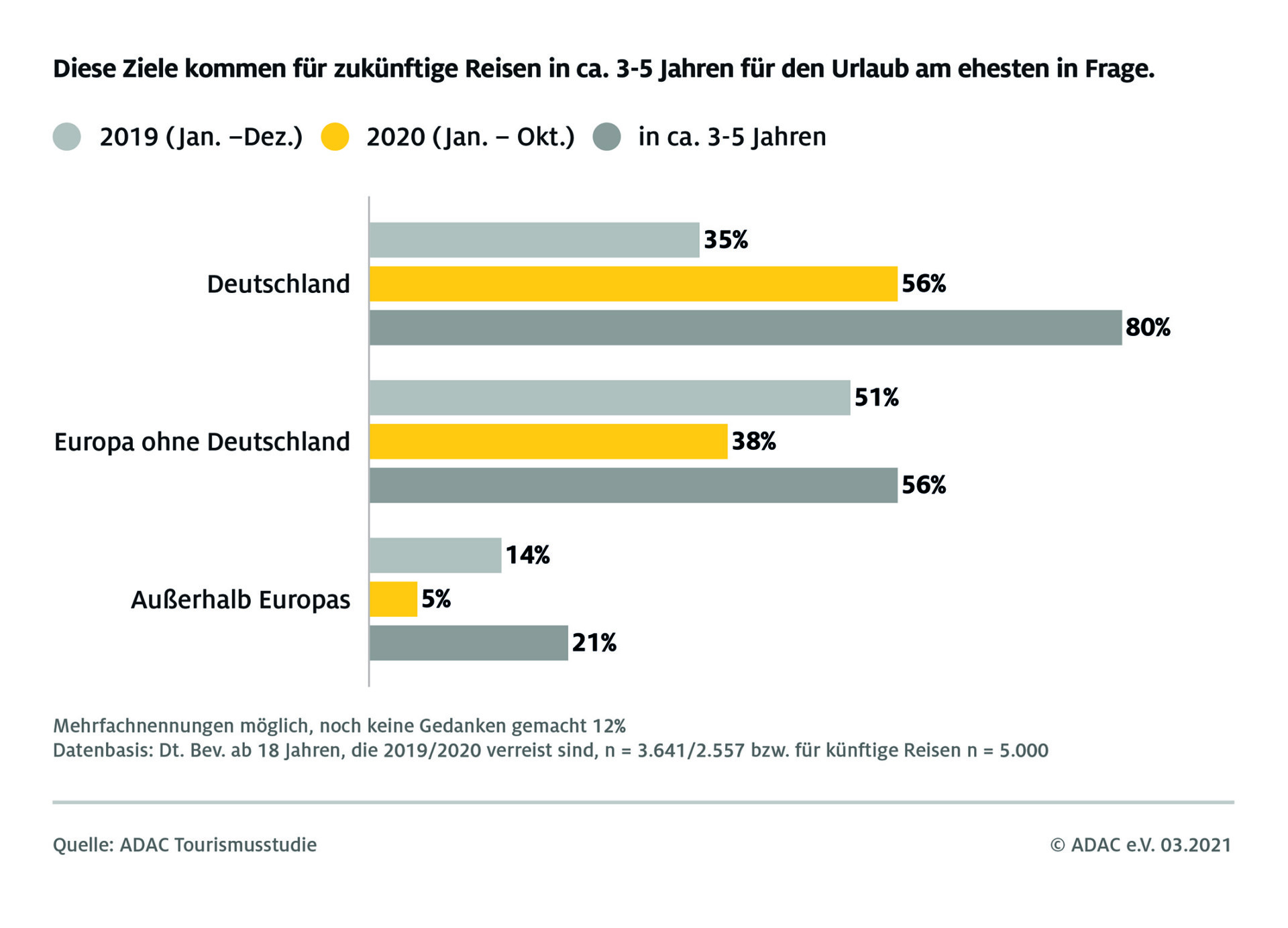 Ein weiteres Ergebnis der ADAC Studie: Deutschland wird als Reiseziel auch 2021 wieder im Fokus stehen. Knapp zwei Drittel der Deutschen wollen demnach auch in diesem Jahr hierzulande Urlaub machen, etwas weniger als die Hälfte strebt ins europäische Ausland und nur 16 Prozent zieht es an Ziele außerhalb Europas. Deutschland dürfte mittelfristig sogar noch beliebter werden. Wie die Umfrage zeigt, hat Deutschland auch mittelfristig vor den anderen europäischen und vor allem den außereuropäischen Ländern als Reiseziel klar die Nase vorn.