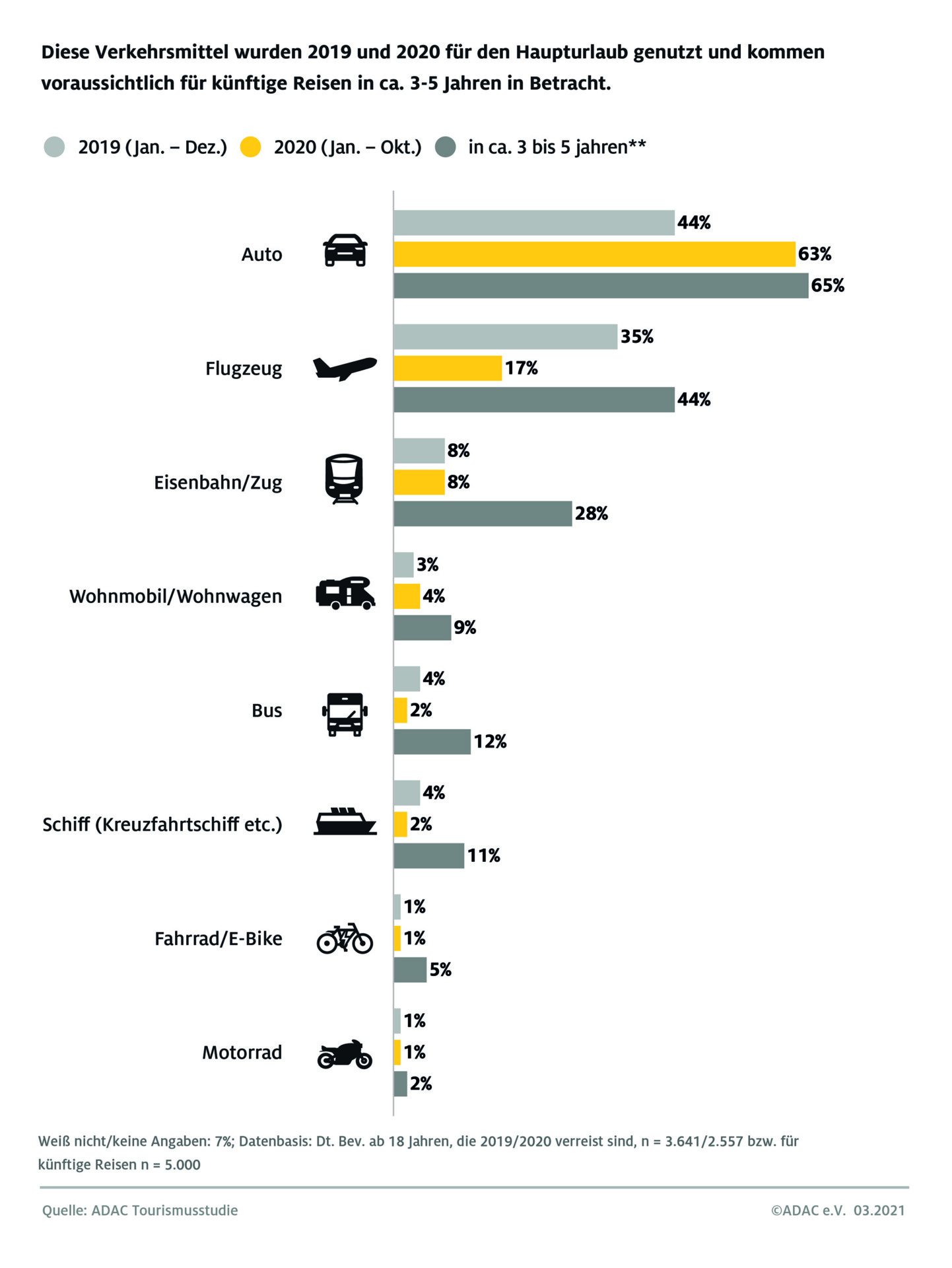 An Bedeutung gewinnt bei den Reisenden auch die Flexibilität bei Buchungen, auch die Ansprüche an Stornobedingungen steigen. Eine deutlich größere Rolle als in Vor-Corona-Jahren dürfte künftig das Verreisen mit dem Auto spielen. 44 Prozent der Befragten gaben an, 2019 mit dem Pkw in den Urlaub gefahren zu sein. 2020 waren es 63 Prozent, und auch künftig werden mehr Menschen auf das Auto zurückgreifen. Reisen mit Flugzeug hat laut ADAC Studie nur im vergangenen Jahr einen Einbruch erlebt. In etwa drei bis fünf Jahren wollen bis zu 44 Prozent – und damit neun Prozent mehr als 2019 – wieder in den Urlaub fliegen. Zu den Gewinnern darf sich auch die Bahn zählen, die mit einem Zuwachs rechnen darf.